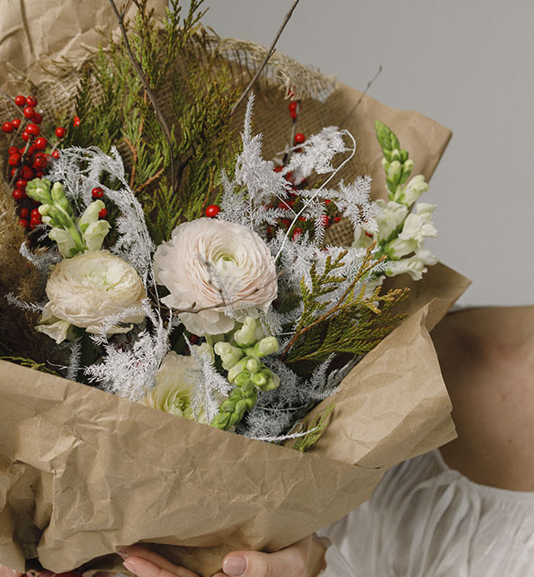 Стильный сезонный букет с атмосферой уюта и природной гармонии. Нежные ранункулюсы пастельных оттенков создают мягкий центр композиции, наполняя её романтичным и трогательным настроением. Соцветия львиного зева добавляют лёгкость и вертикальный ритм, а фактурная зелень полимозиса делает букет объёмным и воздушным. Яркие ягоды илекса и декоративные веточки придают композиции выразительные акценты и подчёркивают её природный, немного зимний характер. Упаковка из крафтовой бумаги завершает образ, добавляя тепла и естественности.