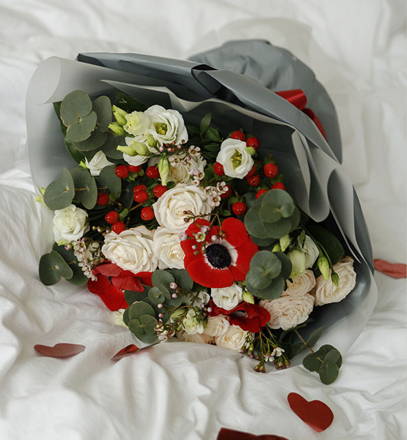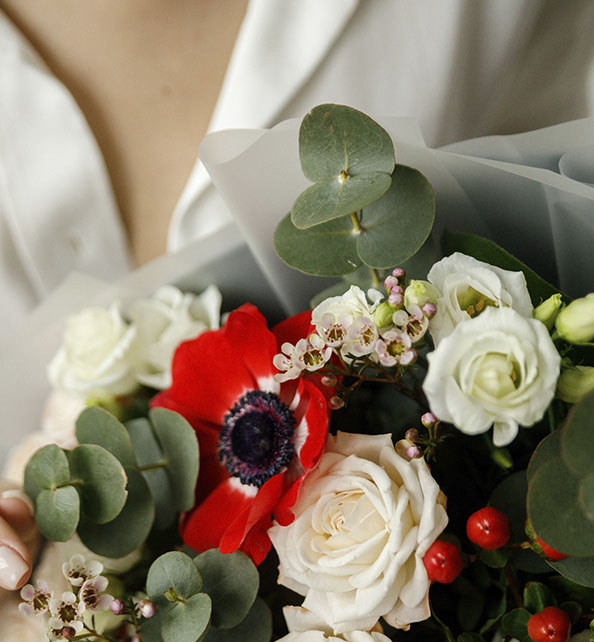 Яркий и выразительный букет, наполненный свежестью и романтикой. Нежные розы и кустовые розы создают мягкую пастельную основу, элегантная эустома добавляет воздушность, а эффектные анемоны вносят стильный контраст. Веточки гиперикума и wax flower придают композиции фактурность и лёгкую игривость. Завершающим штрихом служит благородный эвкалипт, который объединяет все элементы в гармоничный ансамбль.