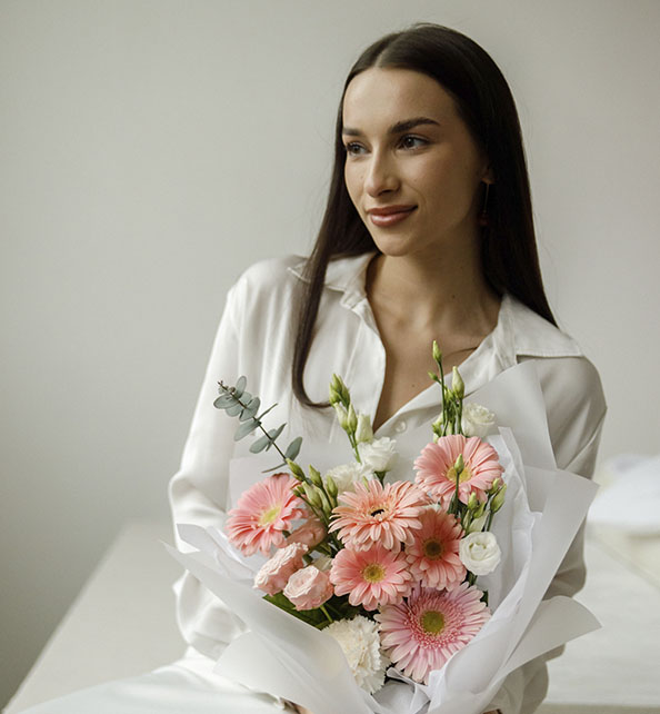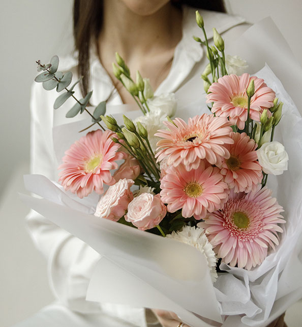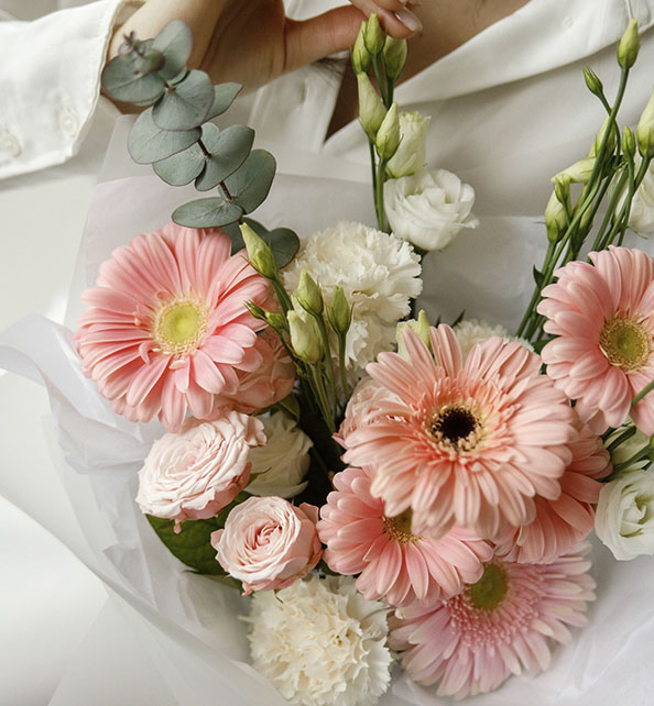 Нежный и светлый букет в мягких пастельных оттенках. Крупные герберы задают композиции выразительный акцент, воздушная эустома добавляет лёгкость и изящество, а пышная гвоздика наполняет букет объёмом и теплом. Веточки эвкалипта гармонично дополняют цветы, придавая свежесть и природную естественность.