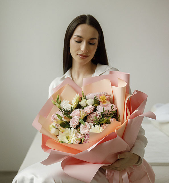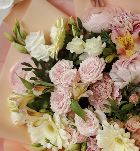 Нежный и воздушный букет в тёплых розово-персиковых оттенках. Пышные ранункулюсы и кустовые розы задают романтичное настроение, герберы добавляют яркие солнечные акценты, а альстромерия, эустома и гвоздика делают композицию объёмной и выразительной. Декоративная зелень придаёт букету свежесть и гармонично объединяет все цветы в единую стильную композицию.