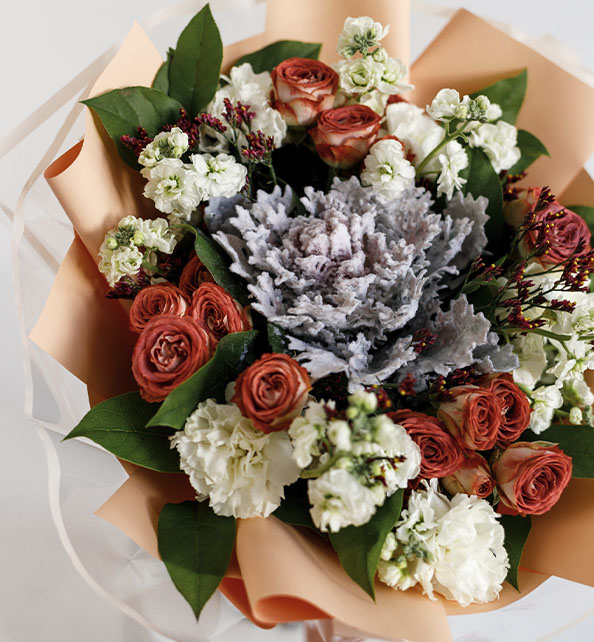 Состав: брассика, роза кустовая, эустома, матиола, лимониум.