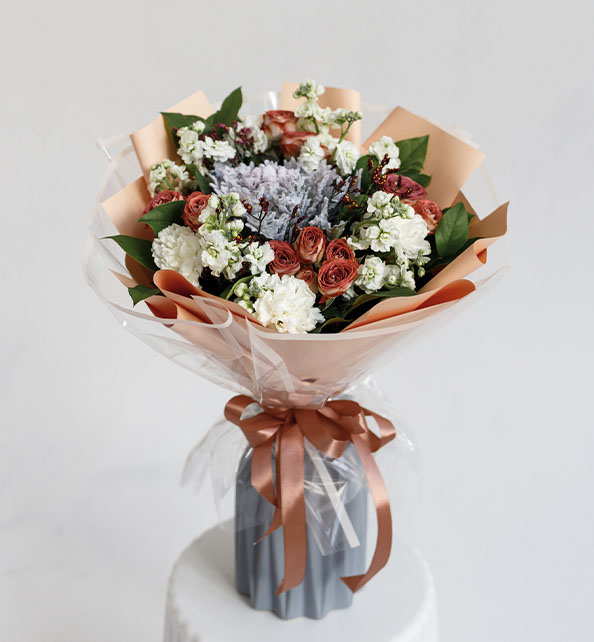 Яркий и выразительный букет с гармоничным сочетанием оттенков и фактур. Нежные соцветия эустомы и кустовой розы создают романтичную основу композиции, воздушная матиола наполняет букет лёгким ароматом, а изящный лимониум добавляет объём и динамику. Декоративная брассика придаёт оригинальный акцент и делает букет особенно стильным и современным.