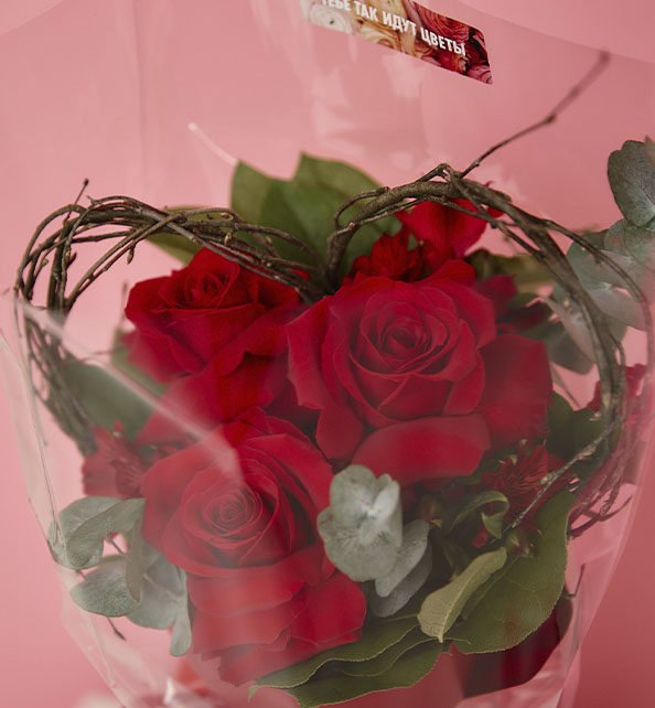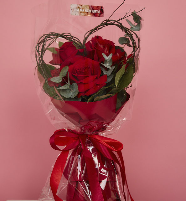 Стильный и лаконичный букет в насыщенной красной гамме, наполненный чувственностью и выразительностью. Классические розы создают яркий и благородный акцент, символизируя любовь и внимание. Веточки эвкалипта добавляют композиции свежесть, лёгкий аромат и природную изысканность, подчёркивая глубину оттенков цветов. Оригинальный декор в виде изящного сердечка придаёт букету особое настроение, делая его трогательным и романтичным подарком.