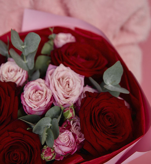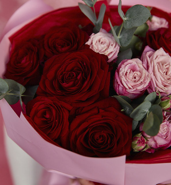 Стильный и выразительный букет в благородной красно-розовой гамме, наполненный глубиной и элегантностью. Крупные классические розы создают яркий акцент и задают основное настроение композиции, а изящная кустовая роза добавляет нежности, объёма и романтичной лёгкости. Веточки эвкалипта вносят природную свежесть, подчёркивают фактурность букета и придают ему современное звучание. Лаконичное сочетание оттенков и форм делает композицию гармоничной, эффектной и по-настоящему запоминающейся.