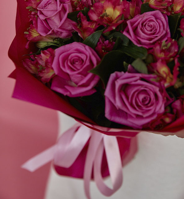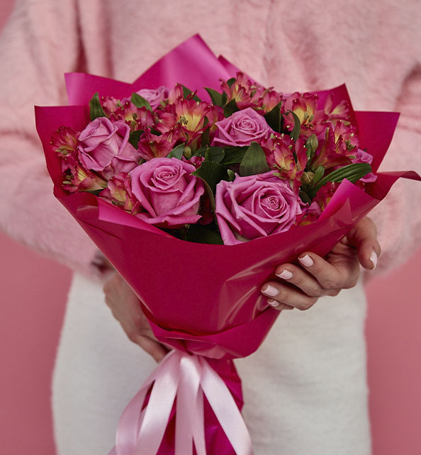 Яркий и выразительный букет в насыщенной розовой гамме, наполненный нежностью и динамикой. Классические розы задают композиции благородный и романтичный характер, а пышные соцветия альстромерии добавляют лёгкости, объёма и природного очарования. Гармоничное сочетание оттенков создаёт эффектный акцент и делает букет по-настоящему праздничным и запоминающимся.