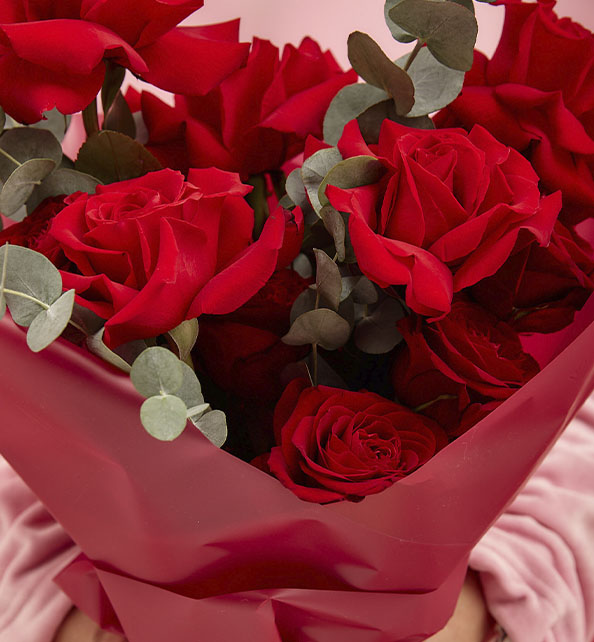 Стильный и выразительный букет в классической красной гамме. Роскошные алые розы создают атмосферу романтики и искренних чувств, а веточки ароматного эвкалипта придают композиции лёгкость, свежесть и природную элегантность. Лаконичное оформление подчёркивает красоту каждого цветка, делая букет универсальным подарком для самых важных моментов.