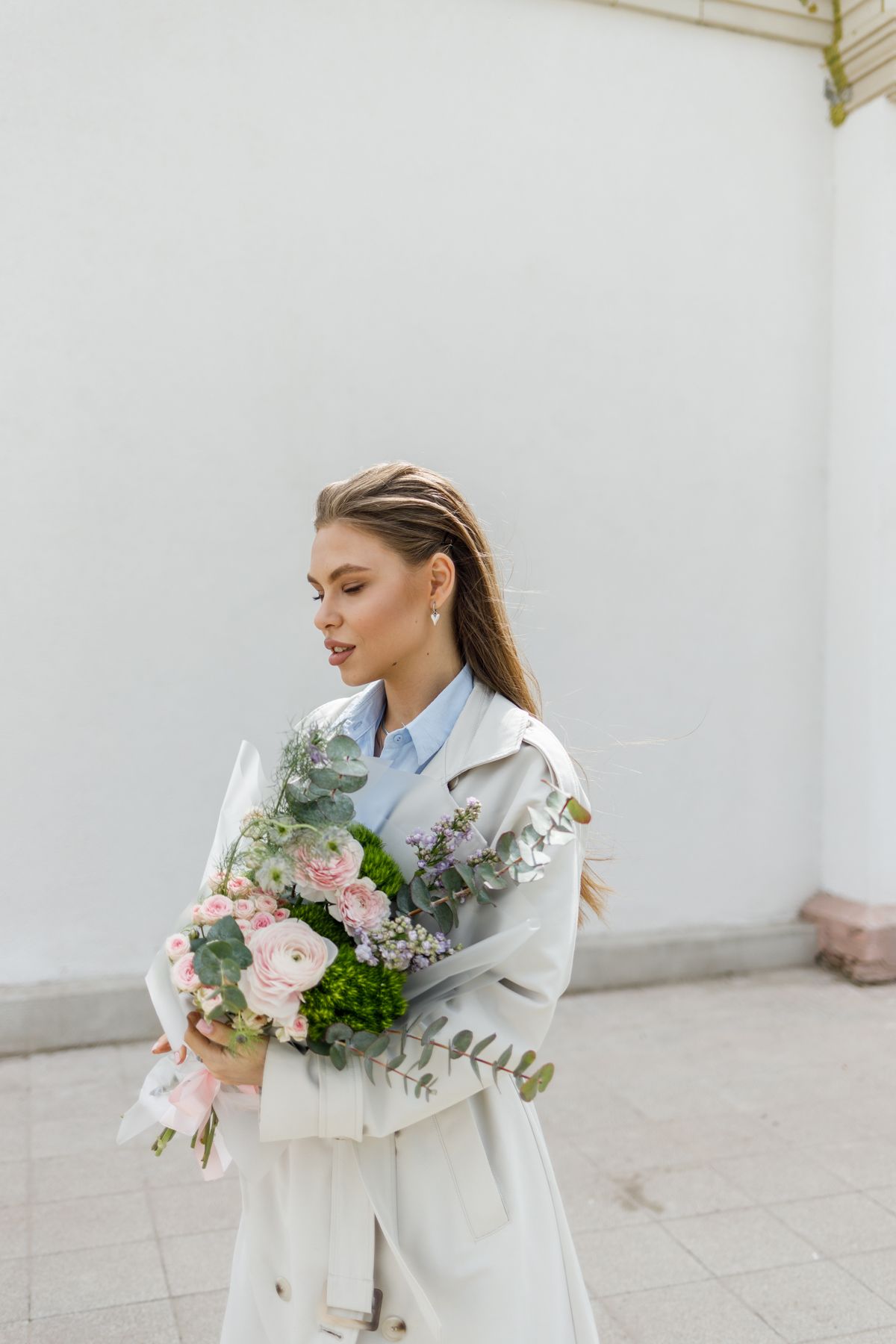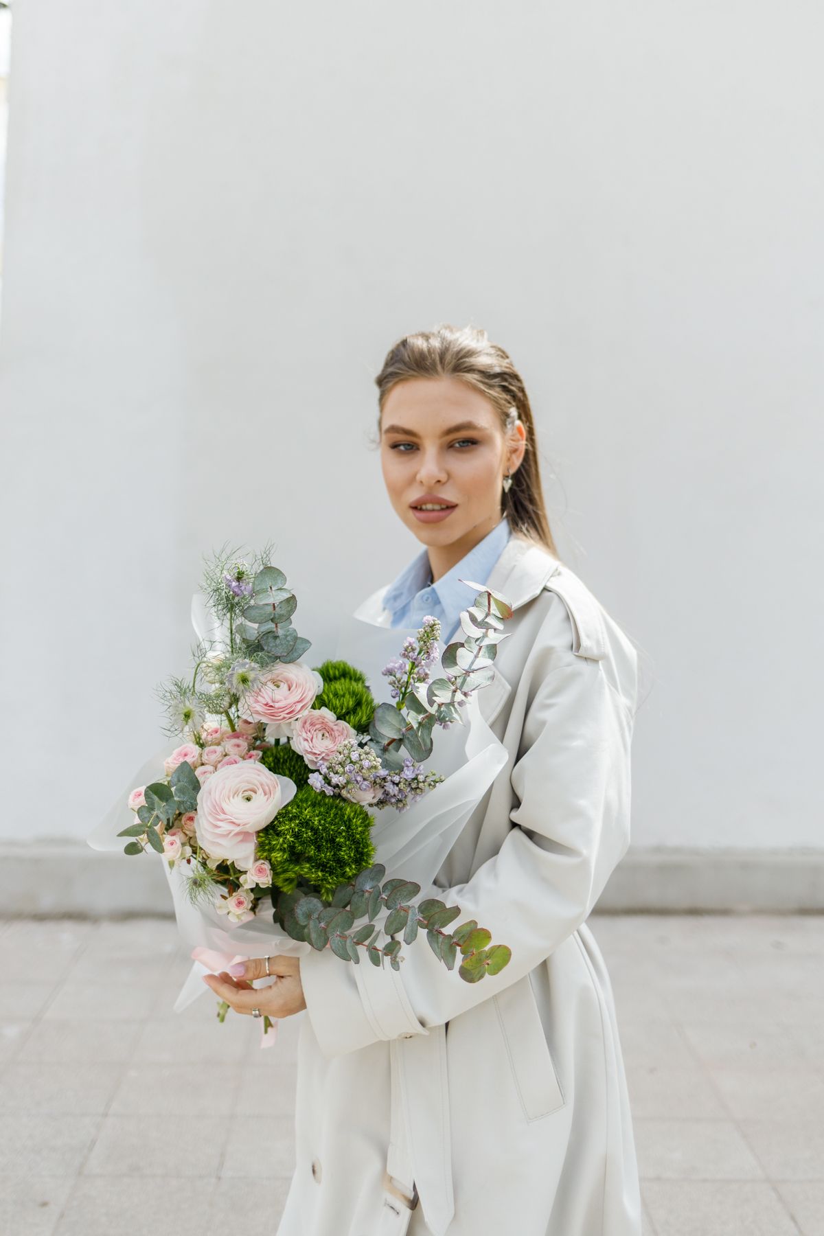 Нежный и многослойный букет с утончённым характером и мягкой природной эстетикой. Ранункулюсы создают объём и изысканную фактуру, кустовые розы добавляют романтичность и глубину, а гвоздика Грин Тик привносит свежие зелёные акценты и оригинальность. Матиола наполняет композицию лёгким ароматом и воздушностью, а эвкалипт завершает образ, добавляя естественную свежесть и стильную текстуру. Такой букет выглядит гармонично и современно, становясь прекрасным подарком для особенного повода.