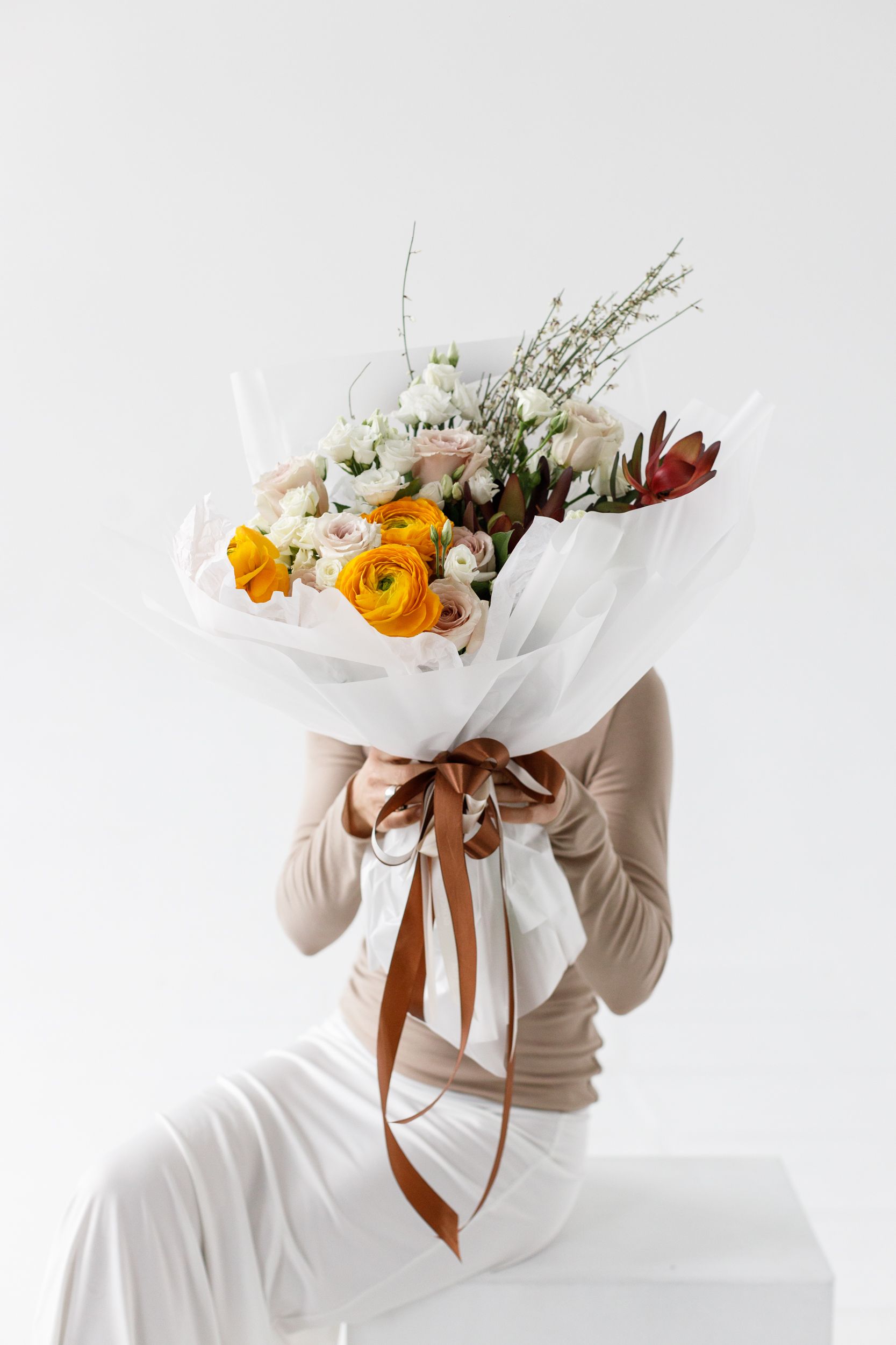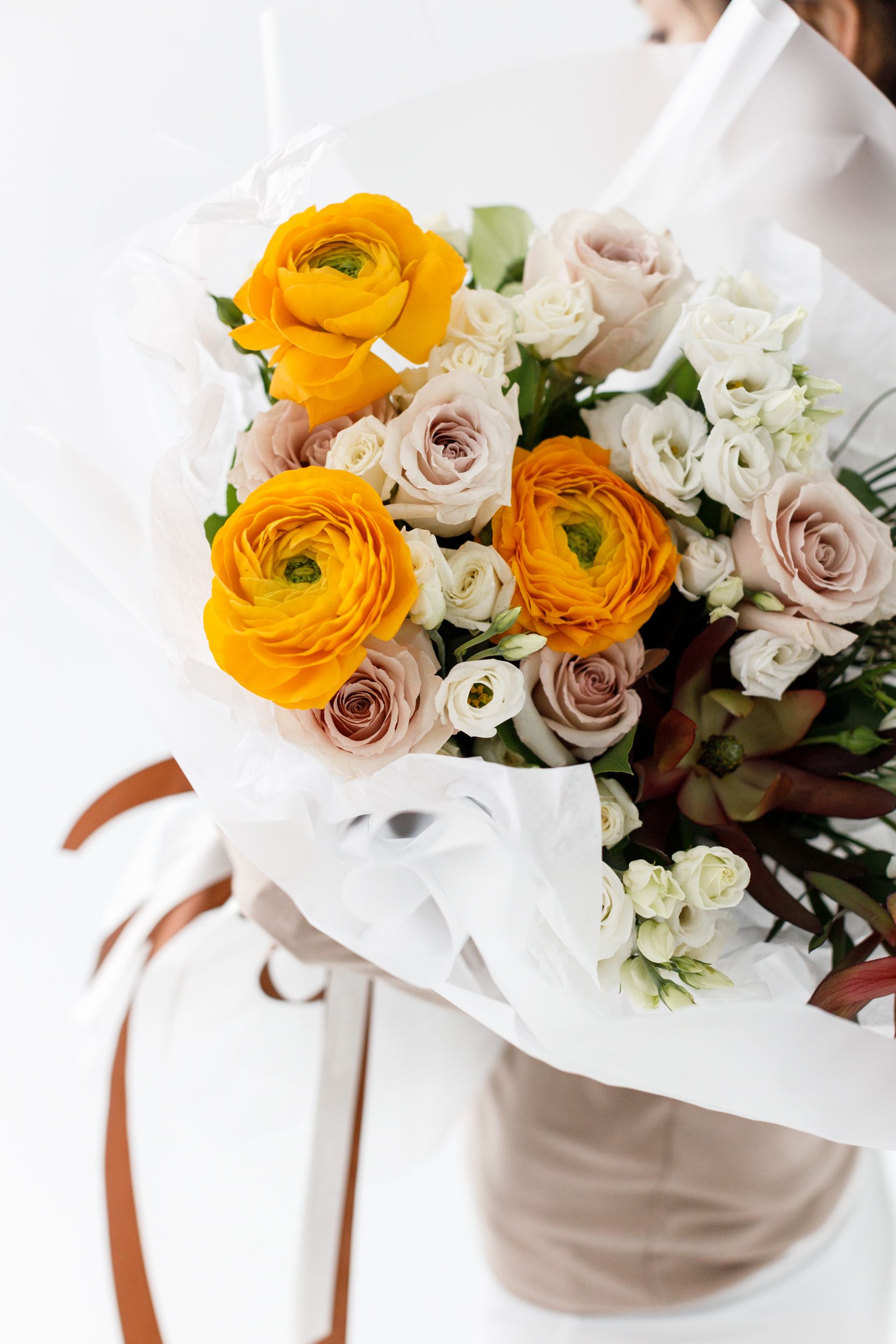 Изысканный букет с благородным характером и выразительной текстурой. Роза придаёт композиции глубину и элегантность, ранункулюс добавляет объём и утончённую многослойность лепестков, а эустома вносит лёгкость и нежность в общий образ. Сафари гинстер создаёт природный акцент и подчёркивает фактурность букета, добавляя ему динамики и современного звучания. В декоративной упаковке композиция выглядит аккуратно и стильно, становясь эффектным подарком для особенного случая.