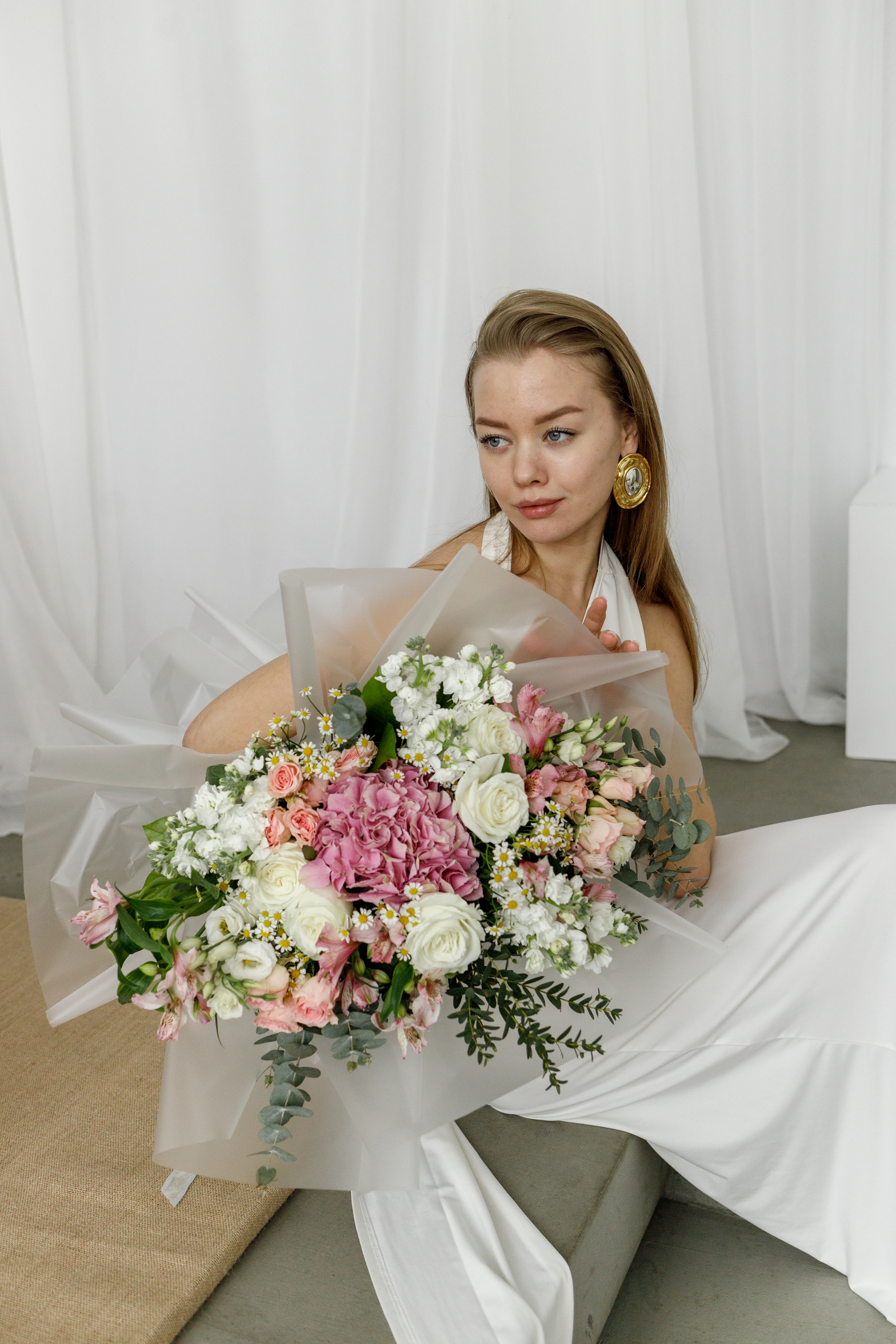 Роскошный и многослойный букет с богатой текстурой и гармоничным сочетанием цветов. Гортензия придаёт композиции пышность и объём, роза добавляет элегантность и романтичность, а кустовая роза создаёт ощущение естественной полноты и изящества. Альстромерия и эустома вносят лёгкость и нежность, танацетум добавляет интересные акценты и фактуру, а эвкалипт наполняет букет свежестью и ароматной зеленью. Такое сочетание формирует эффектный, современный и утончённый образ, который выглядит одновременно празднично и стильно, становясь идеальным подарком для любого важного события.