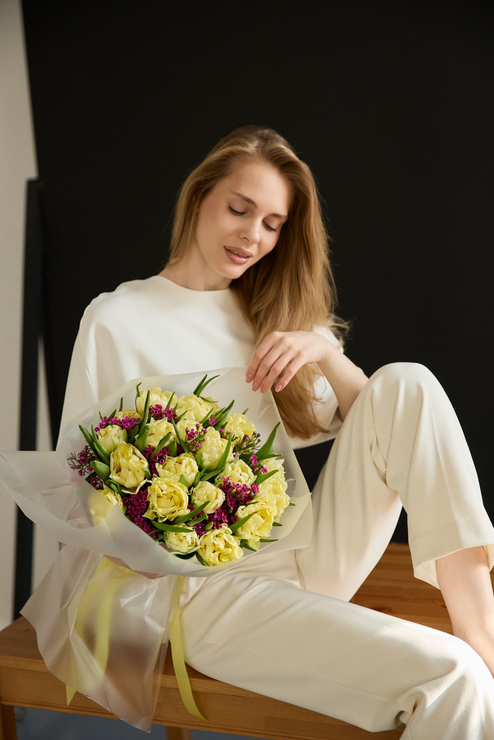 Нежный и стильный букет с лёгким акцентом на природную текстуру. Тюльпаны придают композиции мягкость и живую динамику, создавая ощущение свежести и весеннего настроения, а ваксфлауэр добавляет воздушность и изящные мелкие акценты. Такое сочетание выглядит гармонично и современно, подчёркивая естественную красоту каждого цветка. Букет смотрится аккуратно и утончённо, становясь универсальным подарком для любого повода.