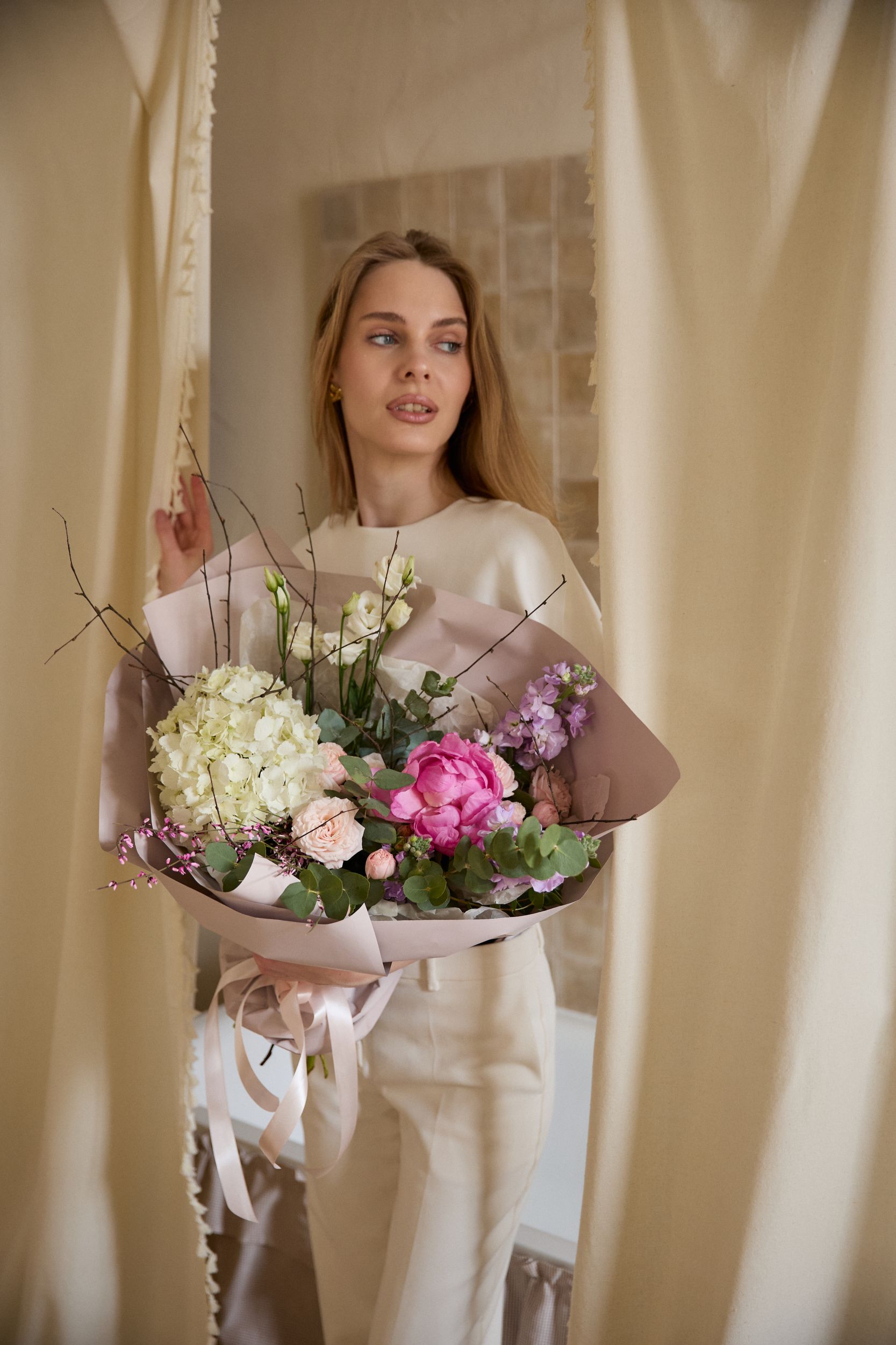 Пышный и утончённый букет с гармоничным сочетанием объёма и нежности. Гортензия придаёт композиции выразительную форму и мягкую воздушность, кустовая роза добавляет романтичность и естественную пышность, а эустома подчёркивает изящество плавными линиями. Матиола наполняет букет деликатным ароматом и лёгкой текстурой, ранункулюс вносит глубину и многослойную красоту лепестков. Такое сочетание создаёт элегантный и современный образ, который выглядит одновременно празднично и изысканно, становясь прекрасным подарком для особенного повода.