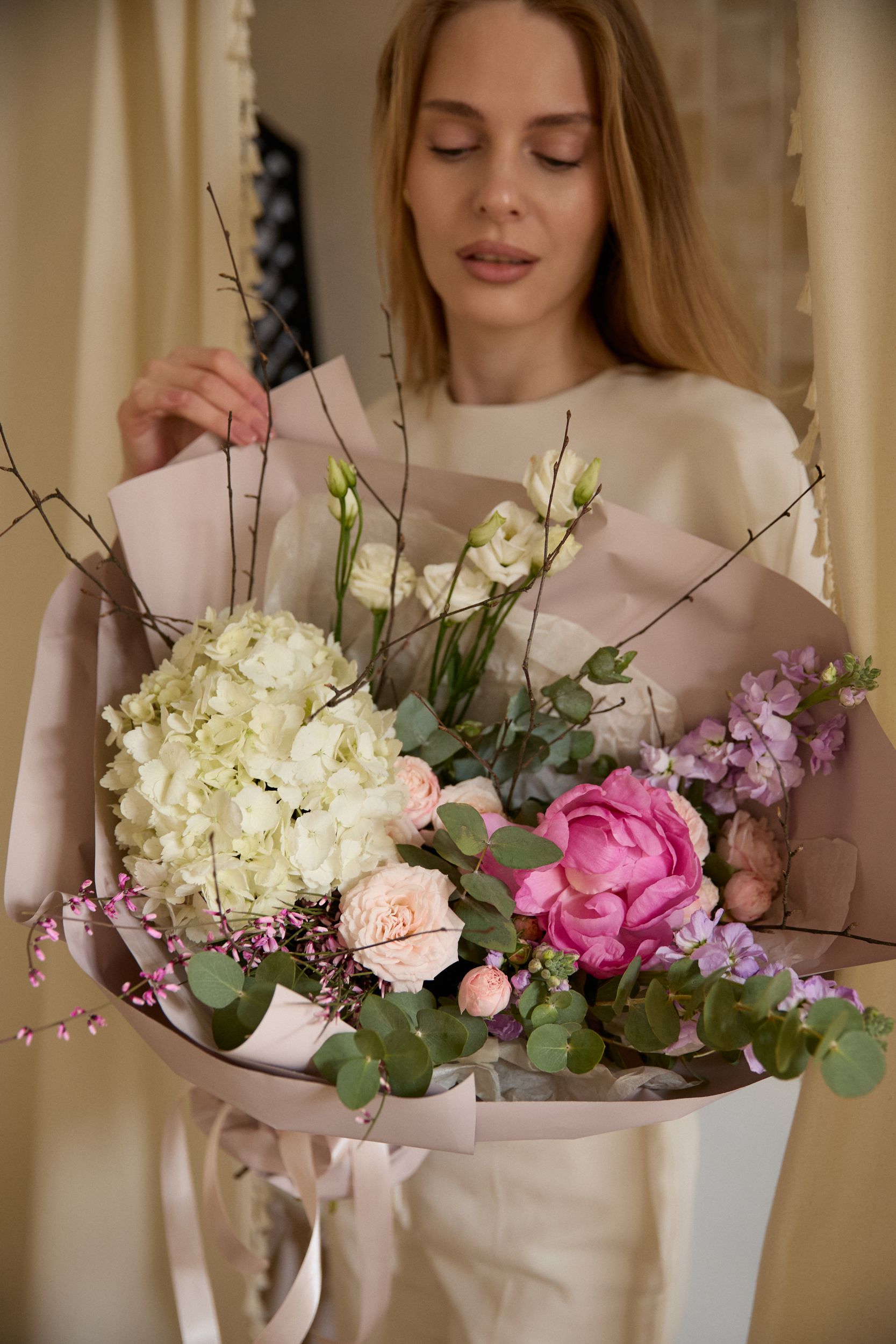 Состав: гортензия, роза кустовая, эустома, матиола, пион