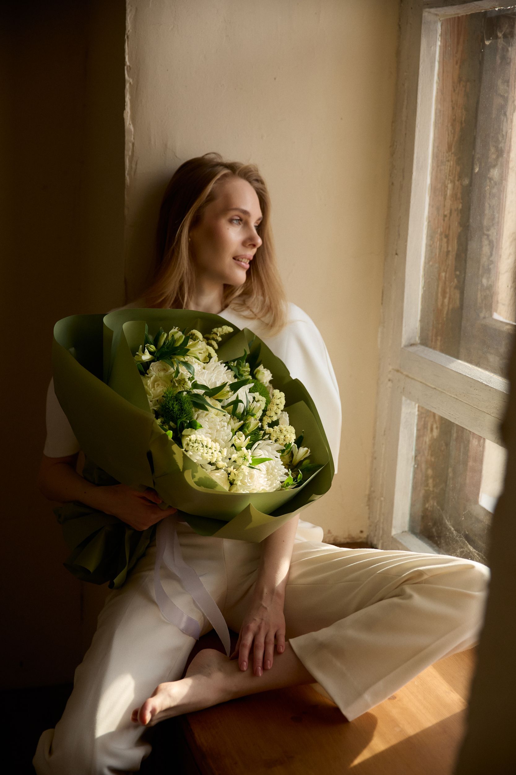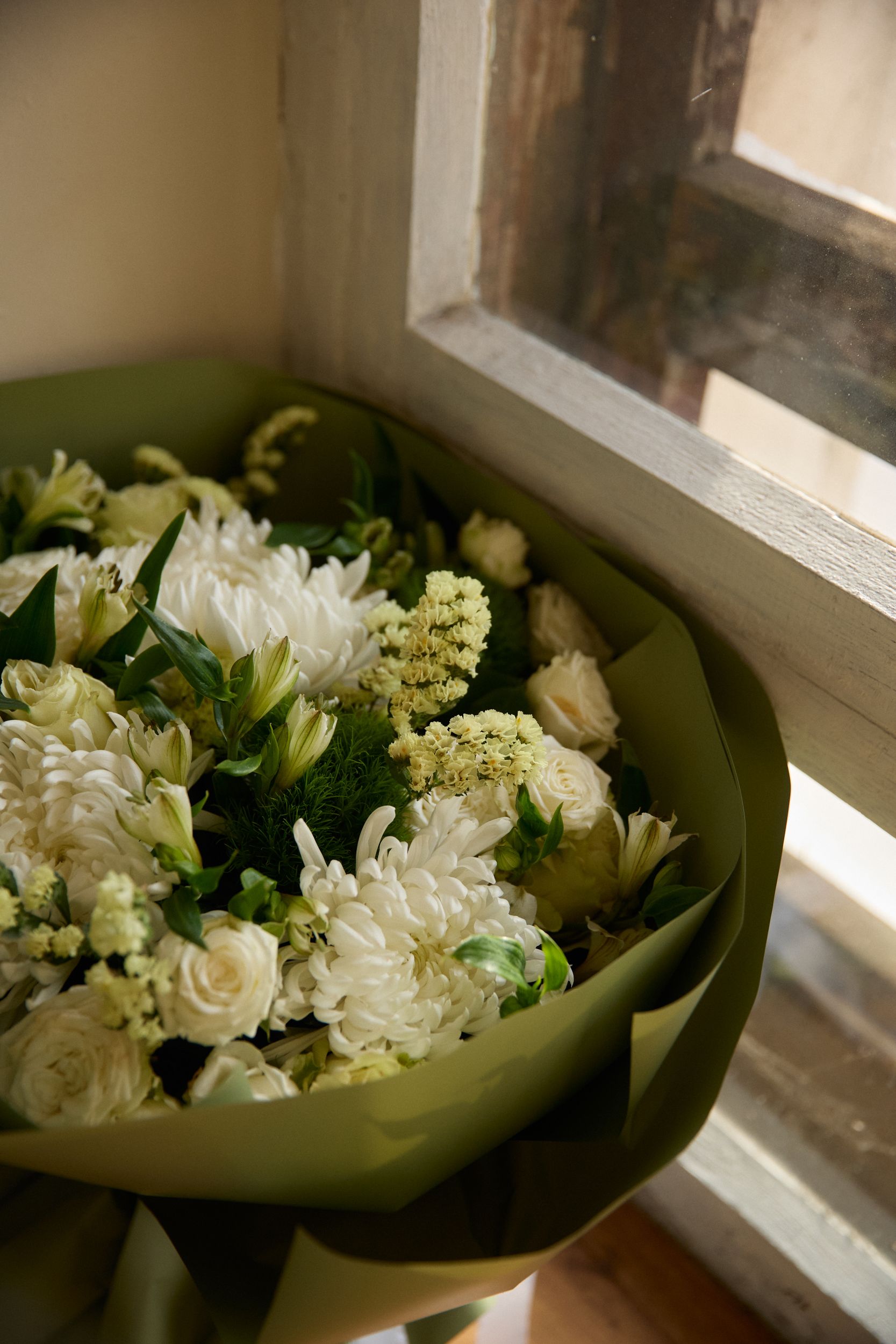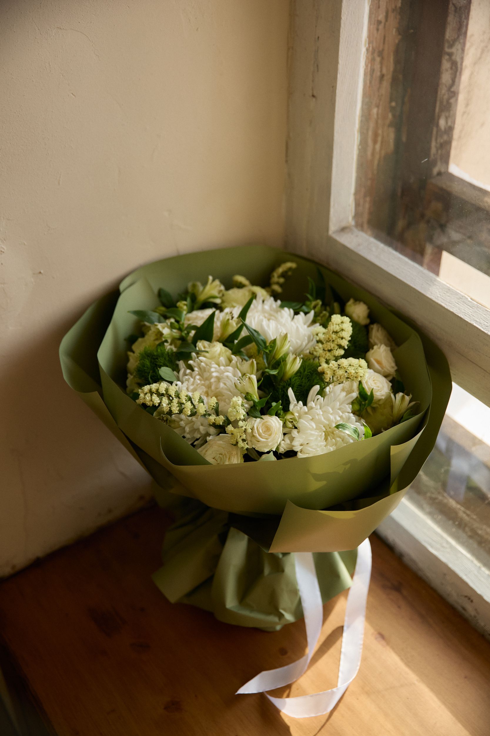 Состав: хризантема одноголовая, статица, альстромерия, гвоздика, грин тик, декоративная упаковка.