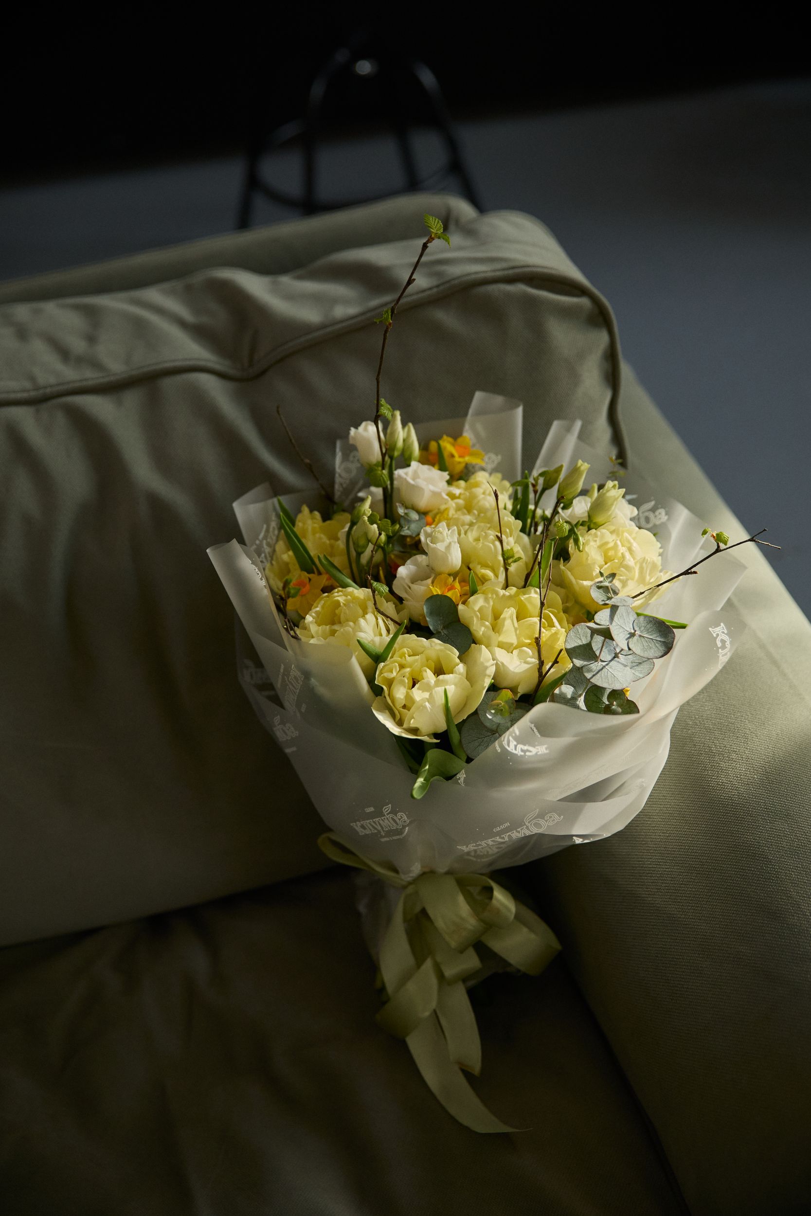 Светлая и выразительная композиция с весенним характером и лёгкой текстурой. Тюльпаны придают образу свежесть и мягкую динамику, эустома добавляет изящества и воздушности, а нарциссы наполняют композицию солнечным настроением и яркими акцентами. Березовые ветки создают структуру и оригинальные линии, а эвкалипт добавляет свежесть и зелёные акценты. Оформленная в декоративную упаковку, композиция выглядит аккуратно и стильно, становясь эффектным подарком для любого весеннего или праздничного случая.