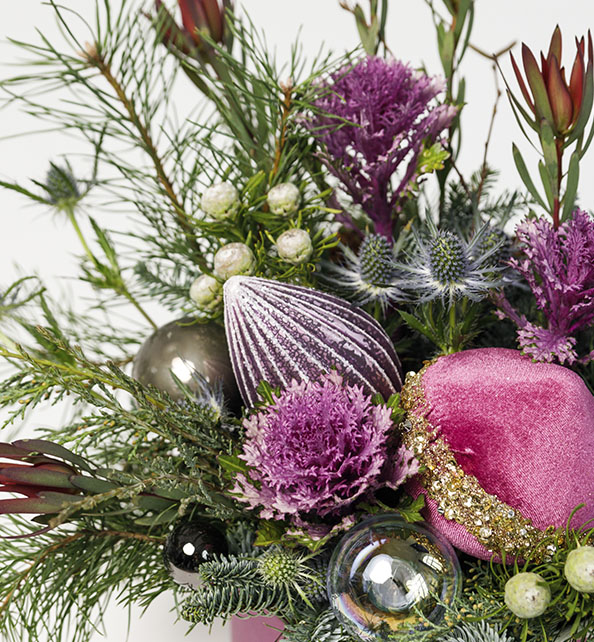 Состав букета: брунья, сафари, эрингиум, хвоя, нобилис, декоративные новогодние элементы.