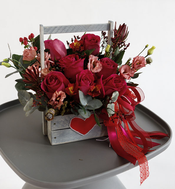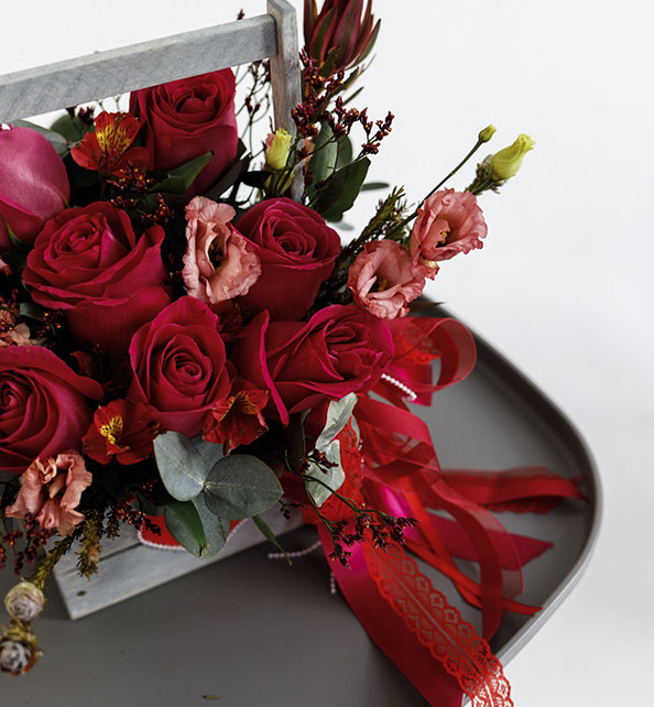 Яркая и эффектная композиция, наполненная страстью и теплом. Насыщенные розы задают выразительный тон и создают роскошный центр букета, нежная эустома и альстромерия добавляют лёгкости и утончённости. Декоративные акценты сафари, гиперикума и лимониума придают работе глубину и текстурность, делая её по-настоящему праздничной и стильной.