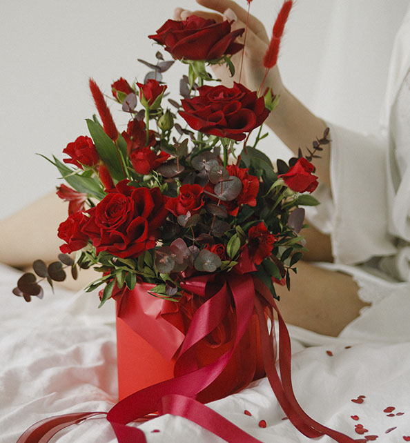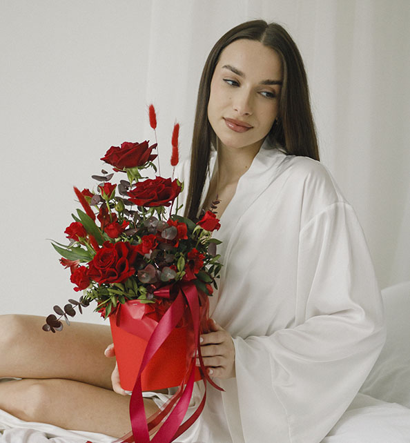 Яркая и элегантная композиция в насыщенных красных тонах. Благородные розы задают основной акцент букета, придавая ему выразительность и романтичность. Нежные альстромерии добавляют лёгкости и изящных деталей, а декоративная зелень делает композицию более объёмной и гармоничной. Стильное оформление и глубокие оттенки создают эффектный подарок с характером и настроением.
