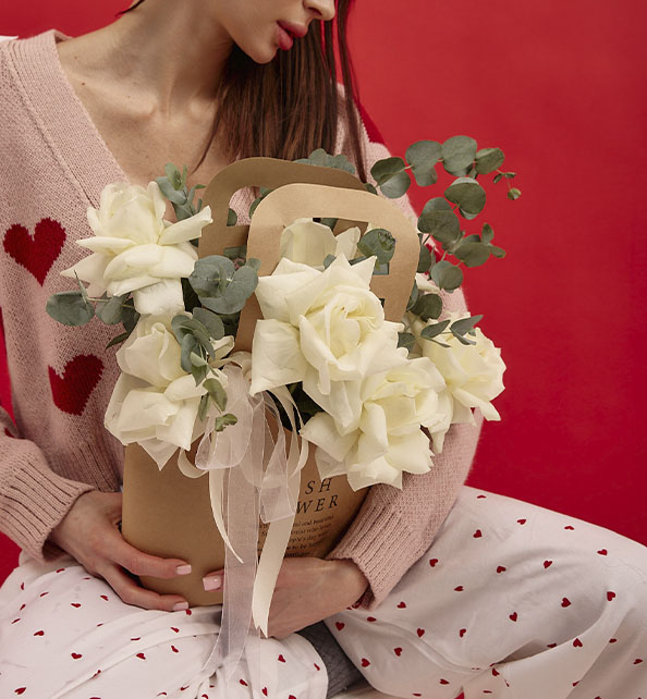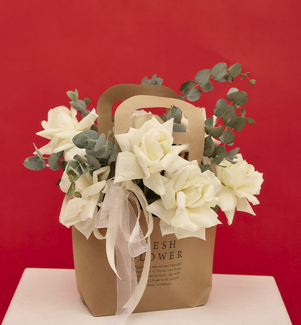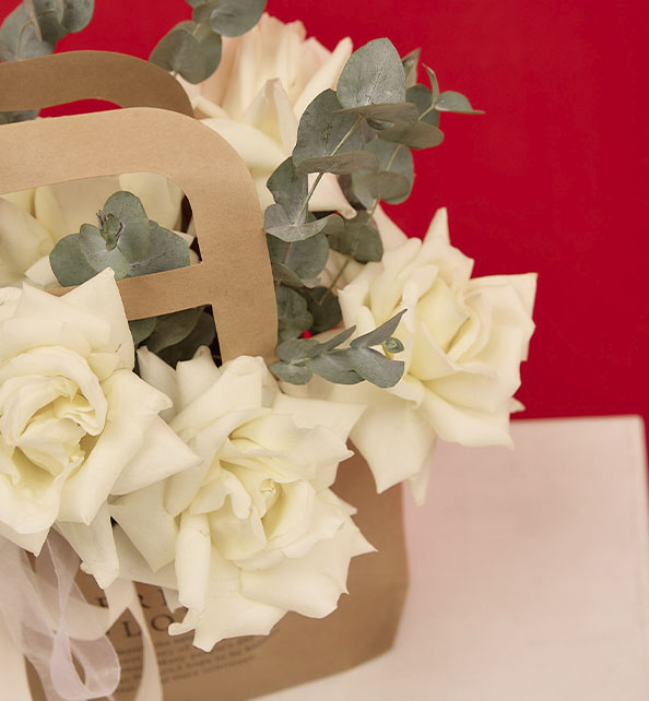 Нежная и утончённая композиция в светлой гамме, наполненная элегантностью и природной свежестью. Белоснежные розы создают атмосферу чистоты и романтики, наполняя букет мягкостью и изяществом. Веточки эвкалипта добавляют лёгкий ароматный акцент и подчёркивают естественную красоту цветов, придавая композиции воздушность и стильную завершённость. Оригинальная упаковка делает букет особенно уютным и современным — идеальный выбор для тёплого и искреннего подарка.