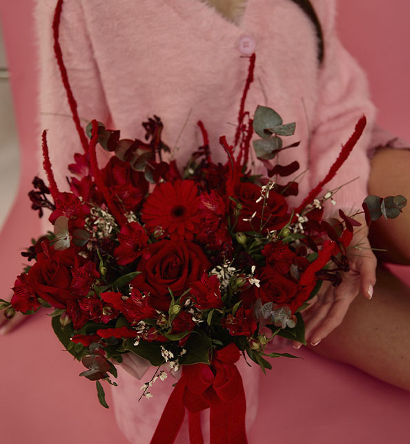 Эффектный букет в насыщенной красной гамме, наполненный энергией и страстью. Классические розы придают композиции благородство и глубину, а кустовые розы добавляют воздушность и многослойность. Яркая гербера становится выразительным акцентом, притягивая внимание своей сочностью и формой. Нежная альстромерия вносит лёгкость и динамику, а изящные веточки гинстера подчёркивают фактурность и создают ощущение природной естественности. Гармоничное сочетание оттенков и текстур делает букет стильным, выразительным и по-настоящему праздничным.