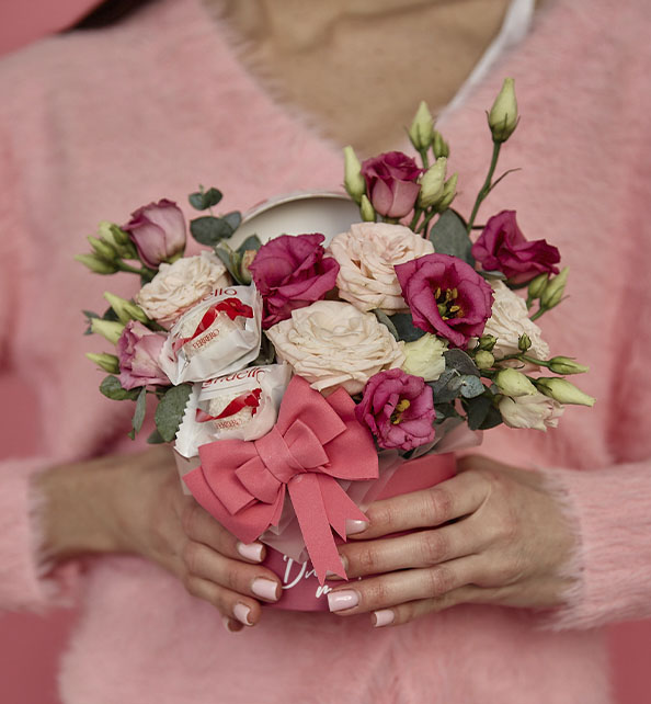 Очаровательная и нежная композиция, сочетающая в себе красоту цветов и приятный сладкий сюрприз. Изящные кустовые розы создают мягкий романтичный акцент, а утончённая эустома добавляет букету воздушности и лёгкости. Гармоничная палитра в тёплых розовых оттенках делает композицию особенно трогательной и уютной. Конфеты «Рафаэлло», аккуратно вплетённые в оформление, придают подарку оригинальность и создают атмосферу заботы и внимания. Идеальный вариант для того, чтобы порадовать близкого человека нежным и вкусным знаком внимания.