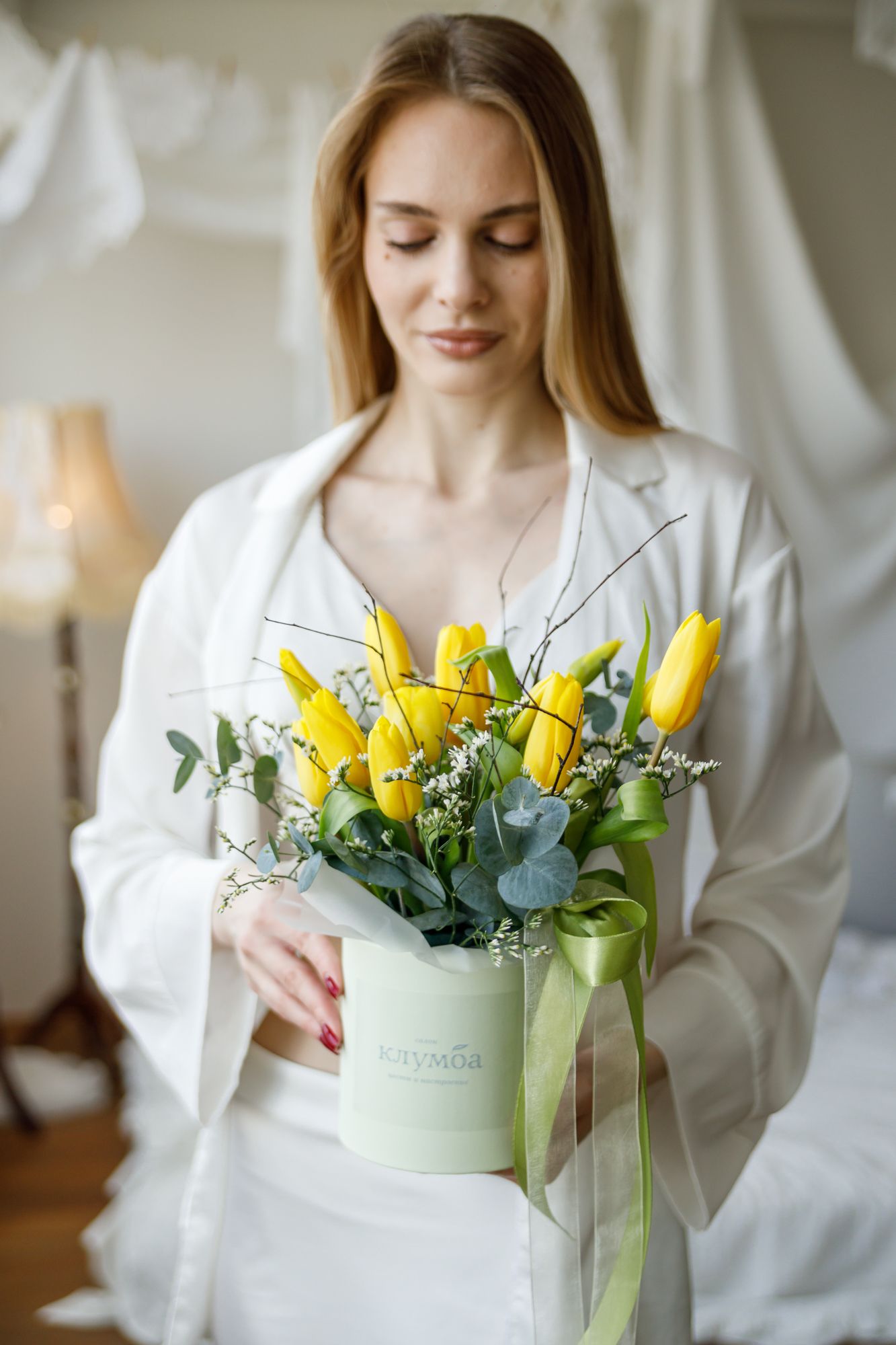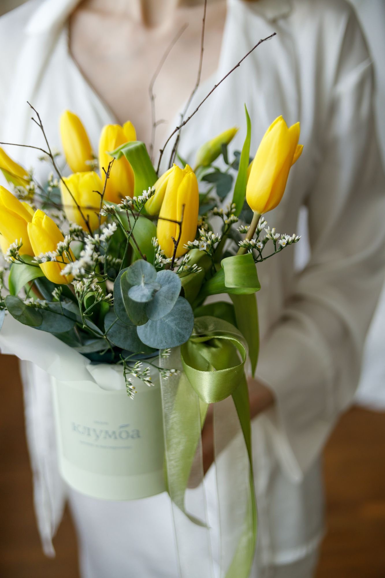 Состав: тюльпаны, лимониум, декоративная коробка или шляпная коробка.