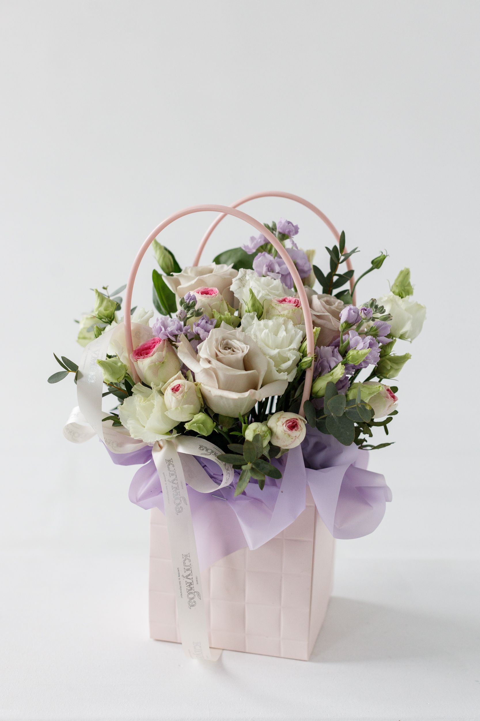 Нежный и утончённый букет с гармоничным сочетанием текстур и мягкой цветочной палитрой. Кустовая роза придаёт композиции объём и романтичное настроение, создавая эффект пышности и естественной лёгкости. Эустома добавляет изящества и плавности линий, а матиола наполняет букет деликатным ароматом и воздушной фактурой. Такое сочетание формирует элегантный и современный образ, который выглядит одновременно трогательно и стильно, становясь прекрасным подарком для особенного случая.