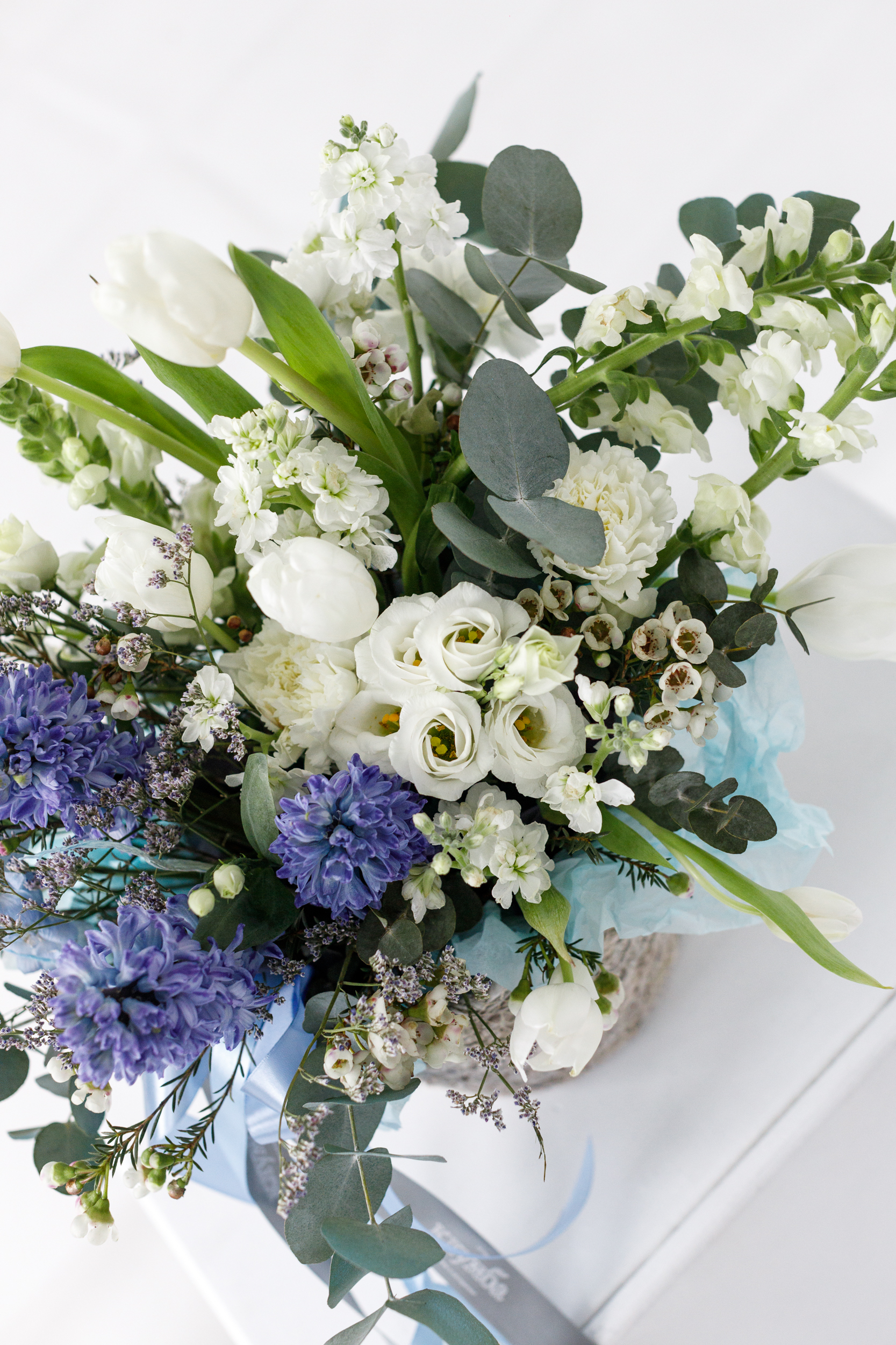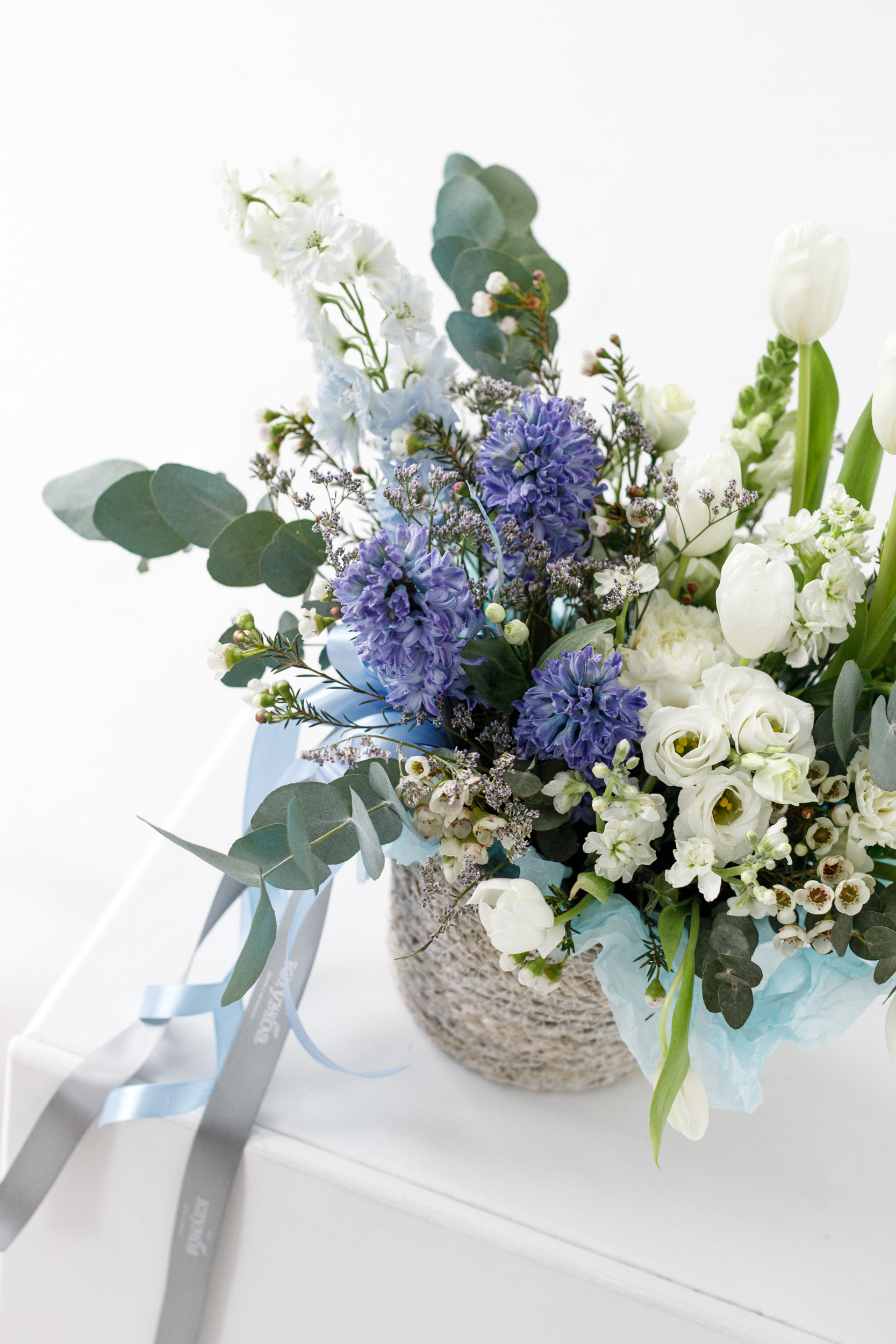 Состав: гиацинты, тюльпаны, дельфиниум, роза кустовая, воксфлауер, львиный зев, тюльпаны.