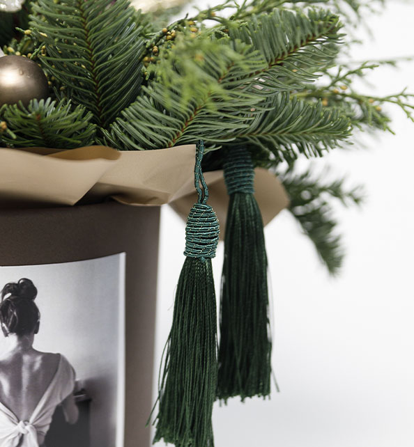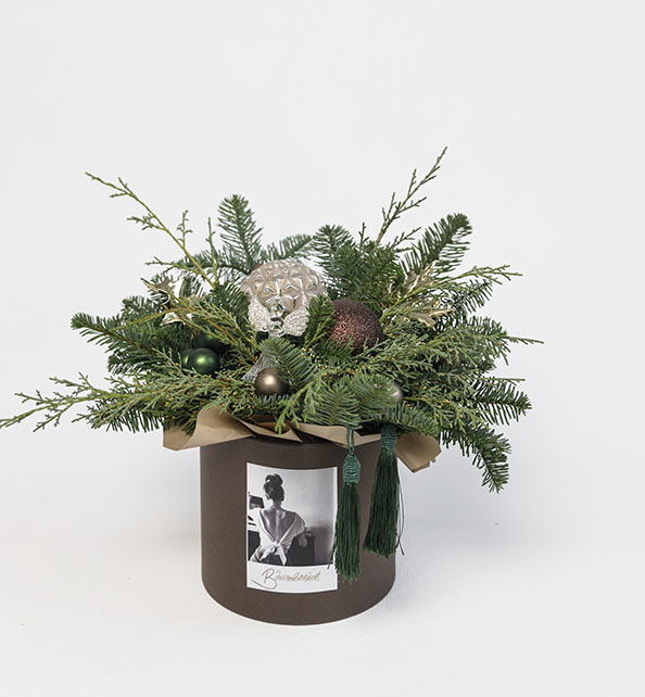 Элегантная зимняя композиция с выразительным праздничным характером. Густая ароматная хвоя и благородный нобилис создают объёмную природную основу, а изящные декоративные ветки добавляют лёгкость и динамику. Новогодние украшения расставляют стильные акценты и придают композиции торжественное настроение. Идеальный вариант для эффектного подарка или атмосферного украшения интерьера.
