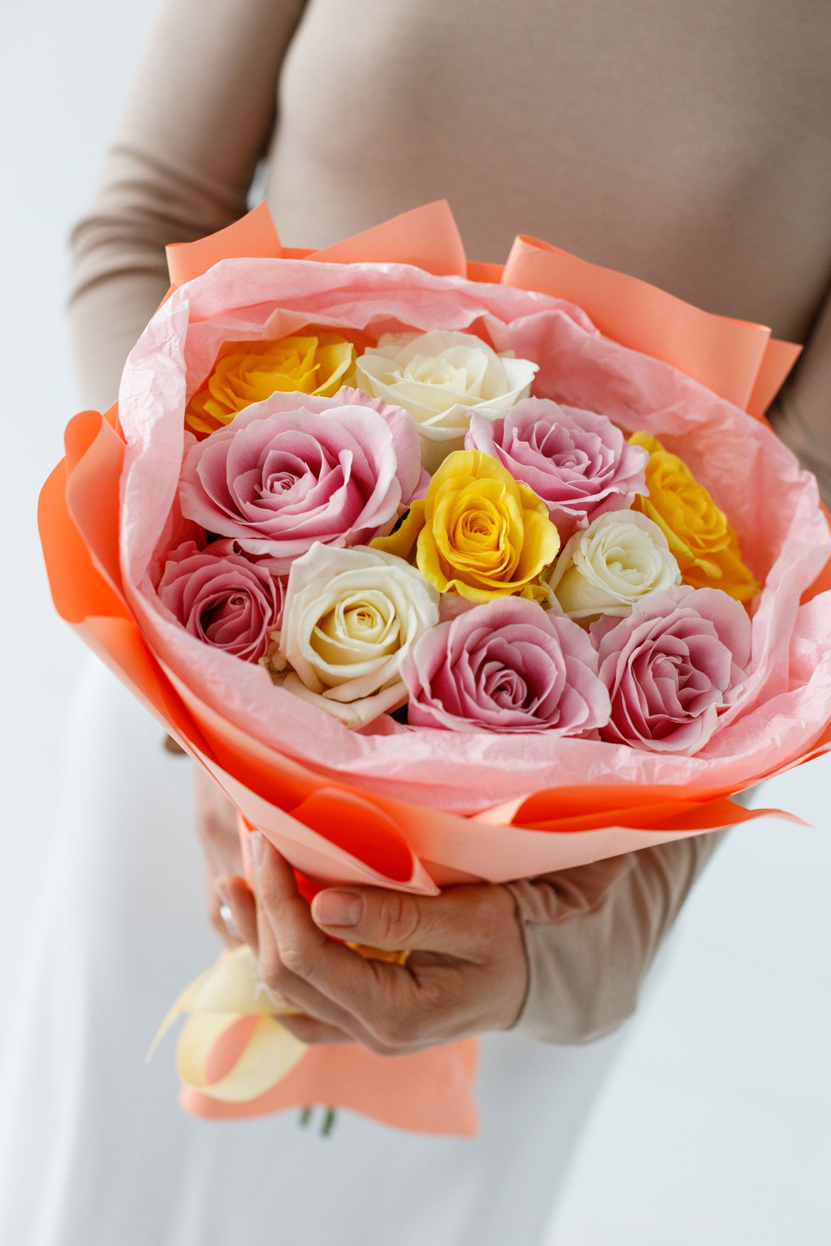 Яркий моно-букет из разноцветных роз — эффектная композиция, наполненная настроением и живыми эмоциями. Каждая роза привносит свой оттенок и характер, создавая гармоничную палитру и выразительный образ. Сочетание разных цветов придаёт букету динамику, глубину и особую индивидуальность, сохраняя при этом элегантность классической формы. Такой букет выглядит стильно и празднично, становясь универсальным подарком для радостных и значимых моментов.