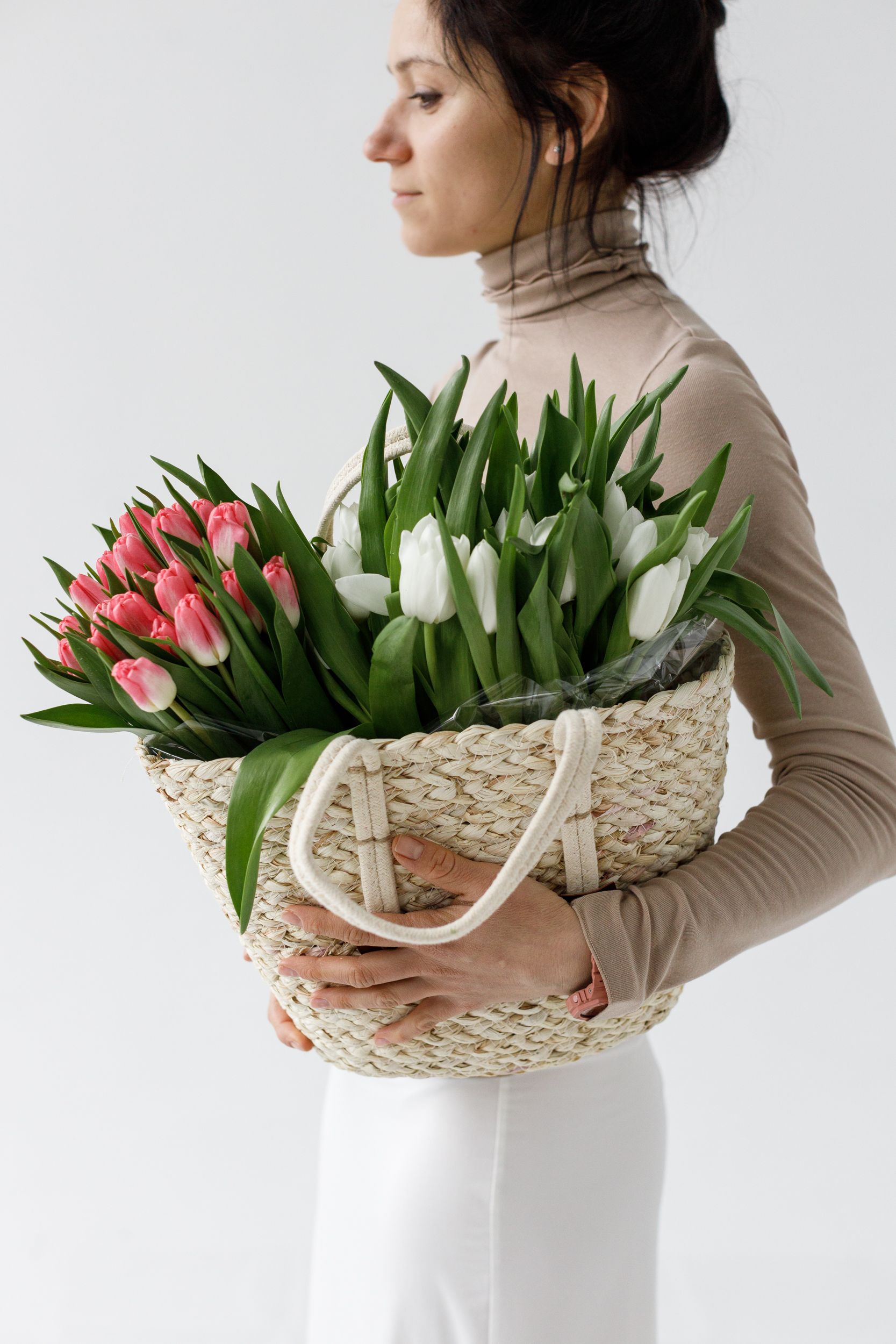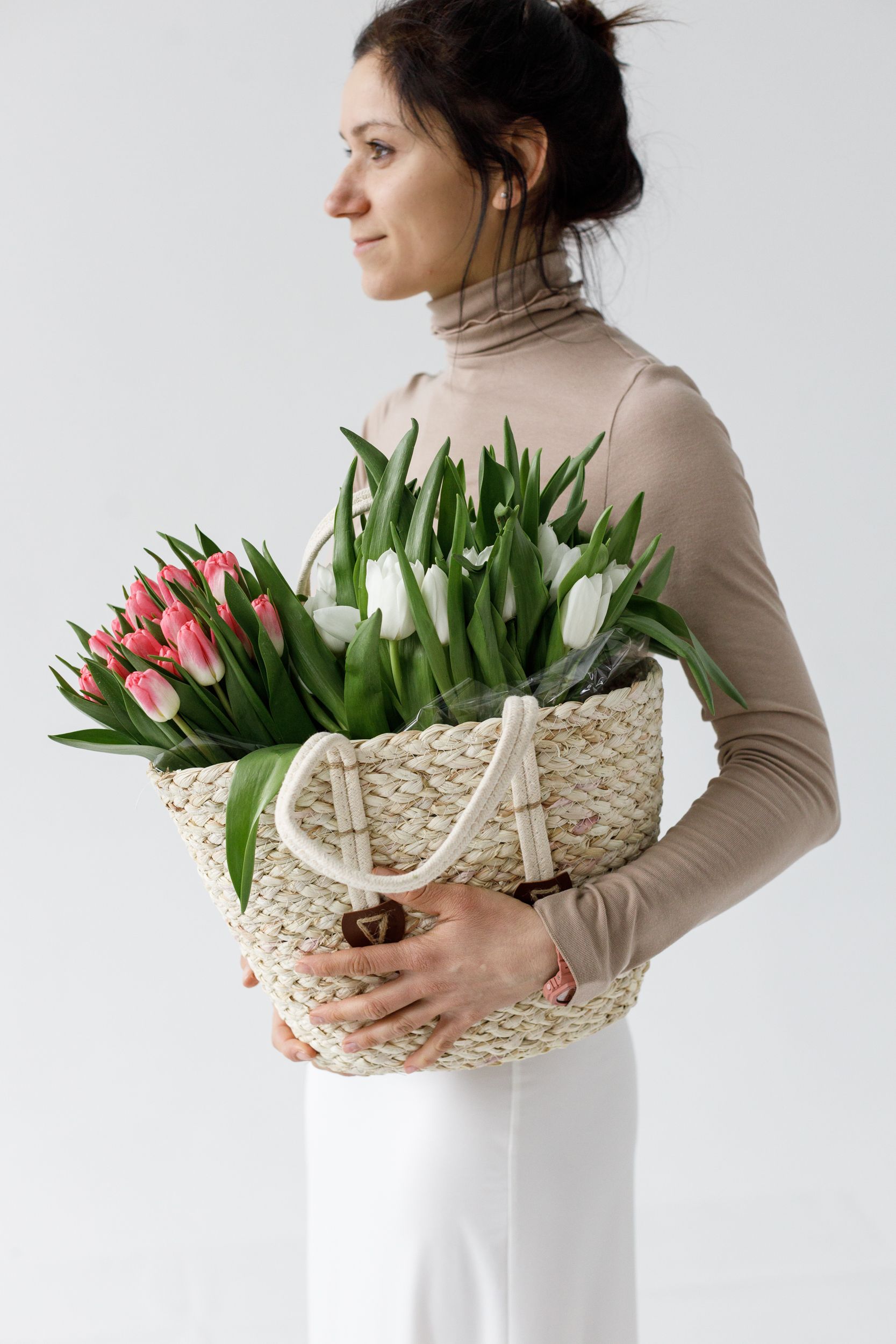 Стильный и лаконичный моно-букет в декоративной сумке — идеальный вариант для элегантного и современного подарка. Однотонные цветы создают гармоничный и выразительный образ, подчёркивая их естественную красоту и форму. Композиция выглядит аккуратно и изысканно, а оформление в декоративной сумке добавляет современный штрих и практичность, делая букет удобным для вручения и эффектным в презентации.