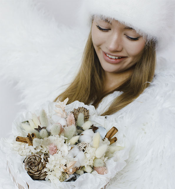 Нежная и утончённая композиция в природных светлых оттенках, наполненная теплом и уютом. Сочетание фактурных сухоцветов, мягкого хлопка и натуральных шишек создаёт гармоничный букет с особым зимним настроением. Лёгкие ноты корицы добавляют ему тонкий аромат и ощущение домашнего тепла, делая композицию идеальным подарком или стильным интерьерным акцентом.