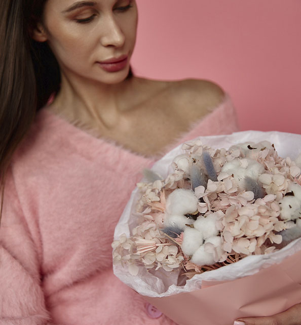 Нежная и утончённая композиция из сухоцветов в мягких пастельных тонах. Воздушные соцветия гортензии, пушистый хлопок и декоративные природные элементы создают атмосферу тепла, уюта и романтики. Такой букет долго сохраняет свою красоту, не требует ухода и станет стильным украшением интерьера или трогательным подарком по любому поводу.