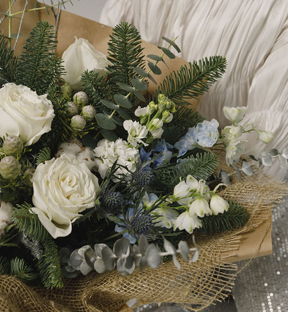 Состав букета: роза, матиола, хлопок, рингеум, брунья, полимозис, эвкалипт.