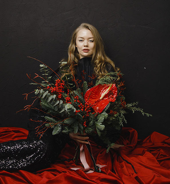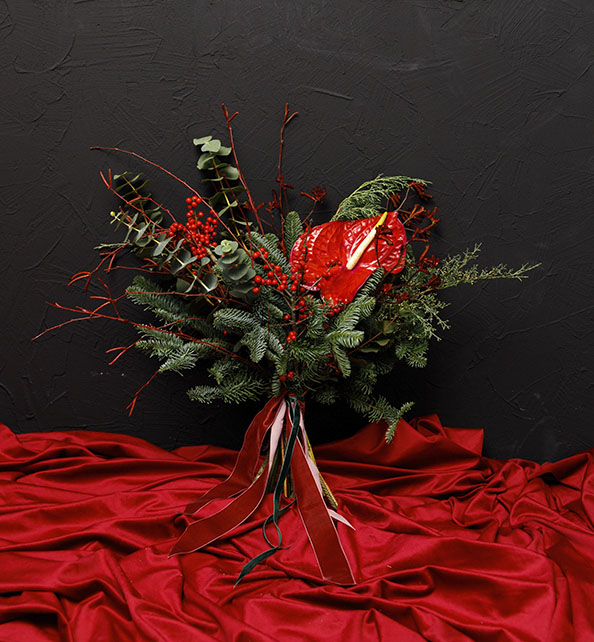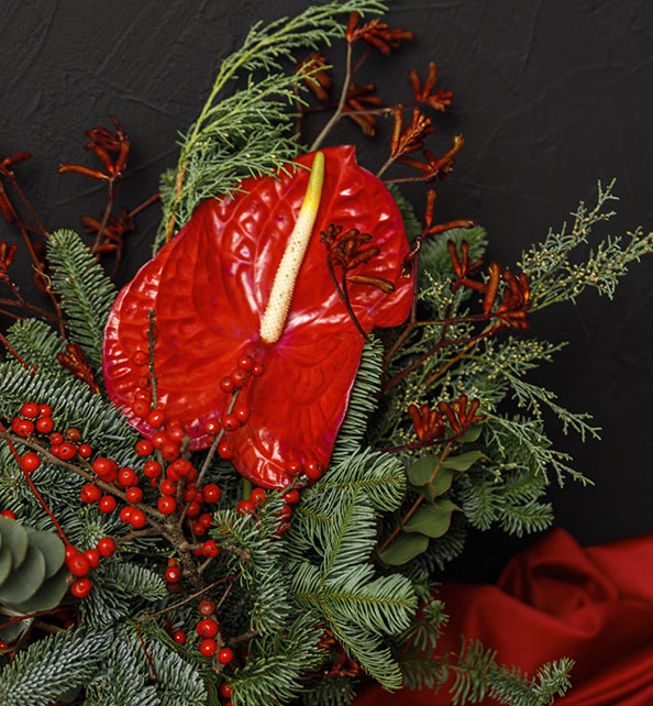 Яркий и эффектный букет с выразительным характером. Насыщенный красный антуриум становится главным акцентом композиции, а веточки хвои создают свежую и объёмную основу. Элегантный эвкалипт добавляет природную лёгкость и глубину, а сочные ягоды илекса подчёркивают праздничное настроение. Стильный выбор для смелого подарка и особенного впечатления.