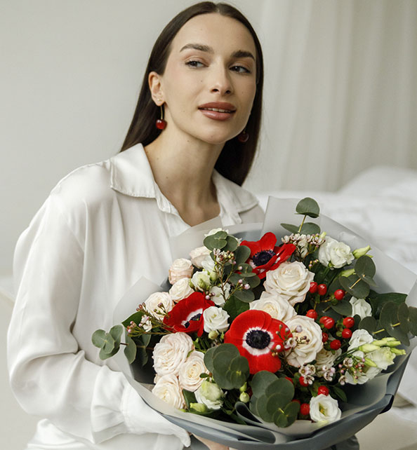 Яркий и выразительный букет, наполненный свежестью и романтикой. Нежные розы и кустовые розы создают мягкую пастельную основу, элегантная эустома добавляет воздушность, а эффектные анемоны вносят стильный контраст. Веточки гиперикума и wax flower придают композиции фактурность и лёгкую игривость. Завершающим штрихом служит благородный эвкалипт, который объединяет все элементы в гармоничный ансамбль.