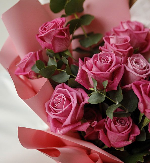 Элегантный и выразительный букет, построенный на классическом сочетании насыщенных роз и благородного эвкалипта. Яркие бутоны роз притягивают внимание глубиной цвета и изысканной формой, а зелёные веточки эвкалипта добавляют композиции свежесть, лёгкость и природную гармонию. Идеальный выбор для тёплого признания, знака внимания или праздничного подарка.