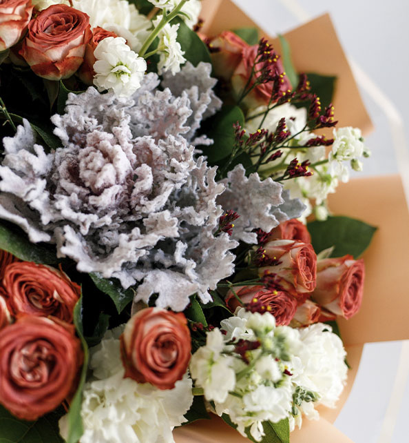 Состав: брассика, роза кустовая, эустома, матиола, лимониум.