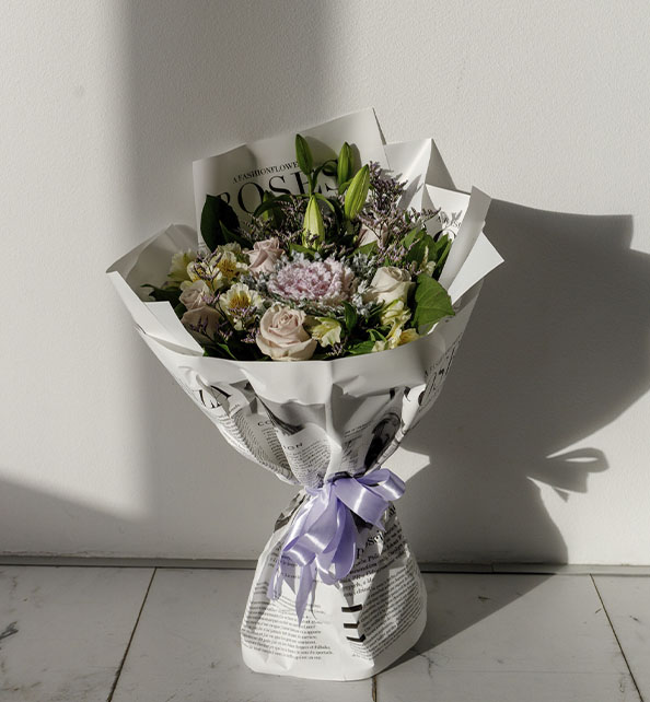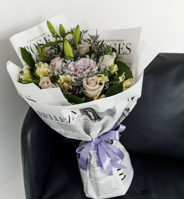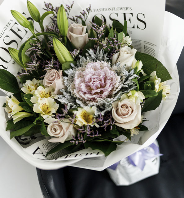 Элегантная и стильная композиция с выразительным характером. Центральный акцент создаёт декоративная брасика, окружённая нежными лилиями и изысканными розами. Альстромерия добавляет букету лёгкости и воздушности, а облачка лимониума придают ему утончённый и завершённый вид. Гармоничное сочетание форм и оттенков делает эту композицию эффектным подарком для особенного случая.