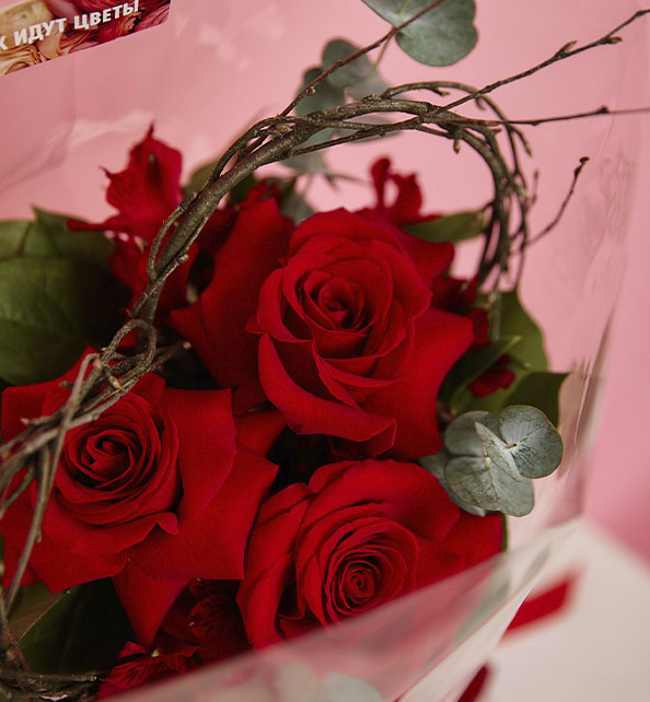 Стильный и лаконичный букет в насыщенной красной гамме, наполненный чувственностью и выразительностью. Классические розы создают яркий и благородный акцент, символизируя любовь и внимание. Веточки эвкалипта добавляют композиции свежесть, лёгкий аромат и природную изысканность, подчёркивая глубину оттенков цветов. Оригинальный декор в виде изящного сердечка придаёт букету особое настроение, делая его трогательным и романтичным подарком.