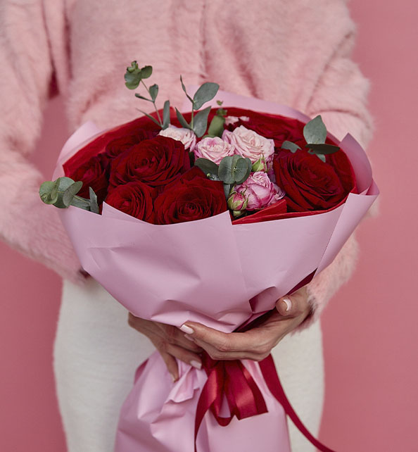 Стильный и выразительный букет в благородной красно-розовой гамме, наполненный глубиной и элегантностью. Крупные классические розы создают яркий акцент и задают основное настроение композиции, а изящная кустовая роза добавляет нежности, объёма и романтичной лёгкости. Веточки эвкалипта вносят природную свежесть, подчёркивают фактурность букета и придают ему современное звучание. Лаконичное сочетание оттенков и форм делает композицию гармоничной, эффектной и по-настоящему запоминающейся.
