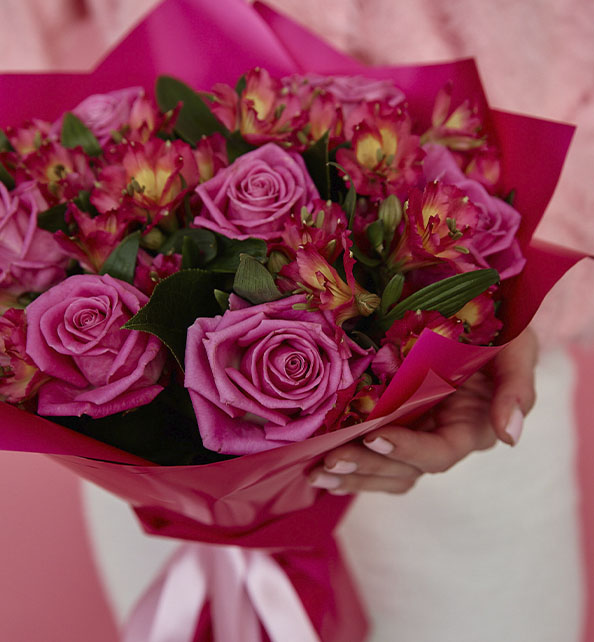 Яркий и выразительный букет в насыщенной розовой гамме, наполненный нежностью и динамикой. Классические розы задают композиции благородный и романтичный характер, а пышные соцветия альстромерии добавляют лёгкости, объёма и природного очарования. Гармоничное сочетание оттенков создаёт эффектный акцент и делает букет по-настоящему праздничным и запоминающимся.