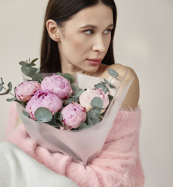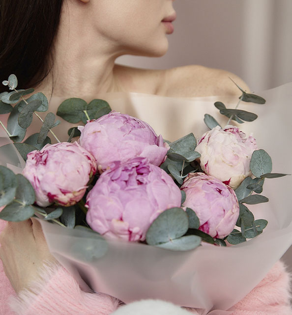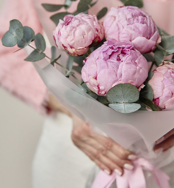 Нежный и утончённый букет, наполненный атмосферой весны и романтики. Пышные бутоны пионов притягивают взгляд своей воздушностью и мягкими розовыми оттенками, создавая ощущение тепла и лёгкости. Веточки эвкалипта гармонично дополняют композицию, добавляя свежесть, природную текстуру и изысканный контраст. Идеальный выбор для выражения самых трепетных чувств.