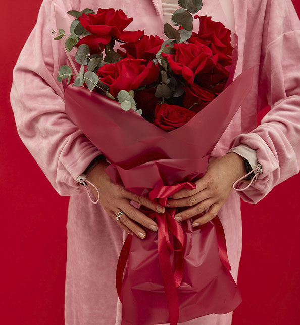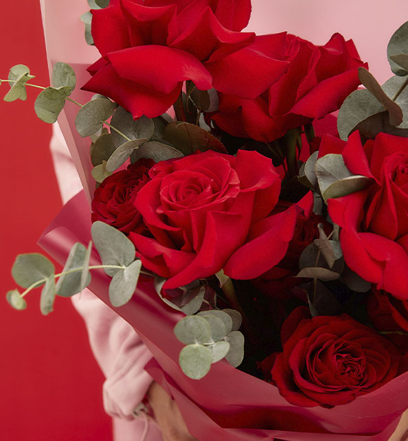 Стильный и выразительный букет в классической красной гамме. Роскошные алые розы создают атмосферу романтики и искренних чувств, а веточки ароматного эвкалипта придают композиции лёгкость, свежесть и природную элегантность. Лаконичное оформление подчёркивает красоту каждого цветка, делая букет универсальным подарком для самых важных моментов.