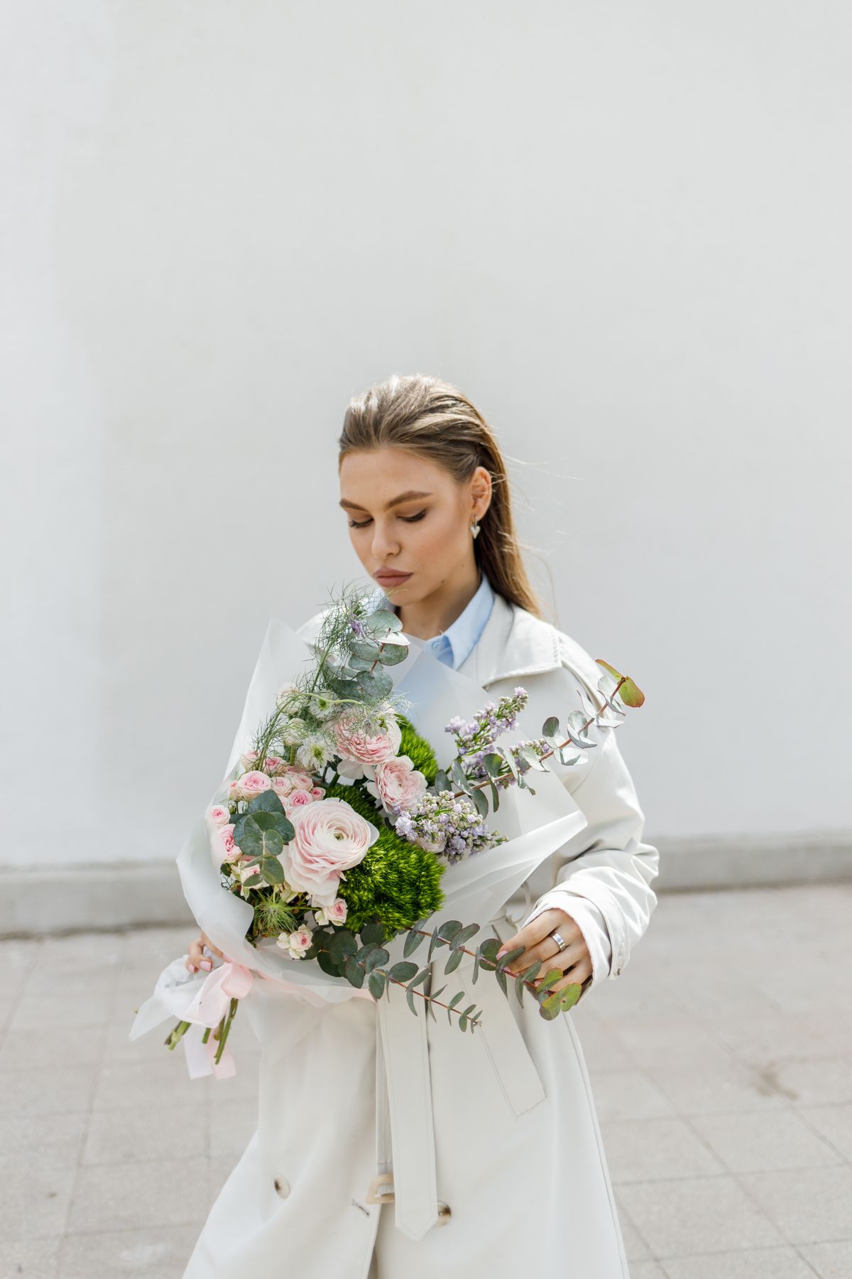 Нежный и многослойный букет с утончённым характером и мягкой природной эстетикой. Ранункулюсы создают объём и изысканную фактуру, кустовые розы добавляют романтичность и глубину, а гвоздика Грин Тик привносит свежие зелёные акценты и оригинальность. Матиола наполняет композицию лёгким ароматом и воздушностью, а эвкалипт завершает образ, добавляя естественную свежесть и стильную текстуру. Такой букет выглядит гармонично и современно, становясь прекрасным подарком для особенного повода.