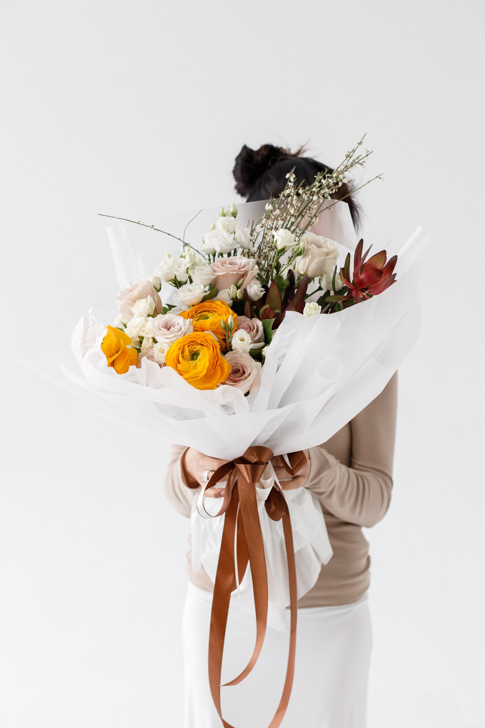 Изысканный букет с благородным характером и выразительной текстурой. Роза придаёт композиции глубину и элегантность, ранункулюс добавляет объём и утончённую многослойность лепестков, а эустома вносит лёгкость и нежность в общий образ. Сафари гинстер создаёт природный акцент и подчёркивает фактурность букета, добавляя ему динамики и современного звучания. В декоративной упаковке композиция выглядит аккуратно и стильно, становясь эффектным подарком для особенного случая.