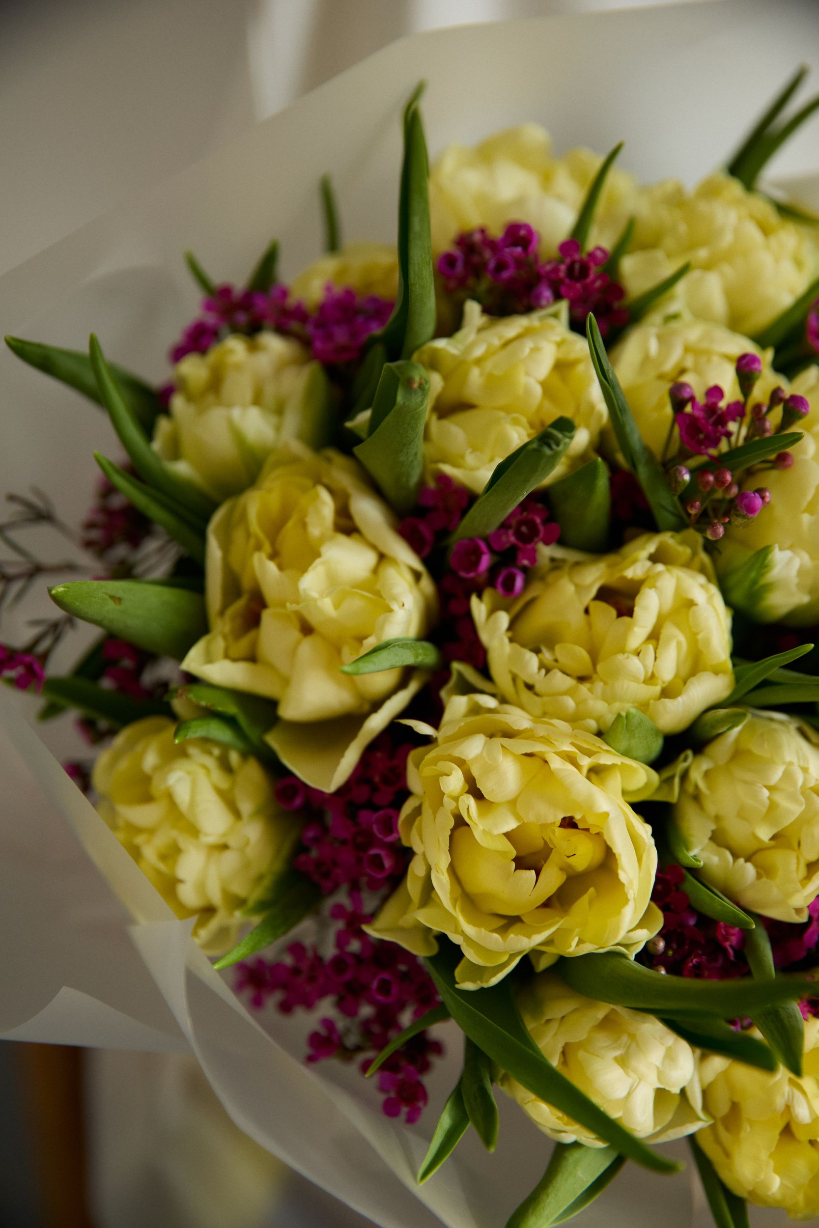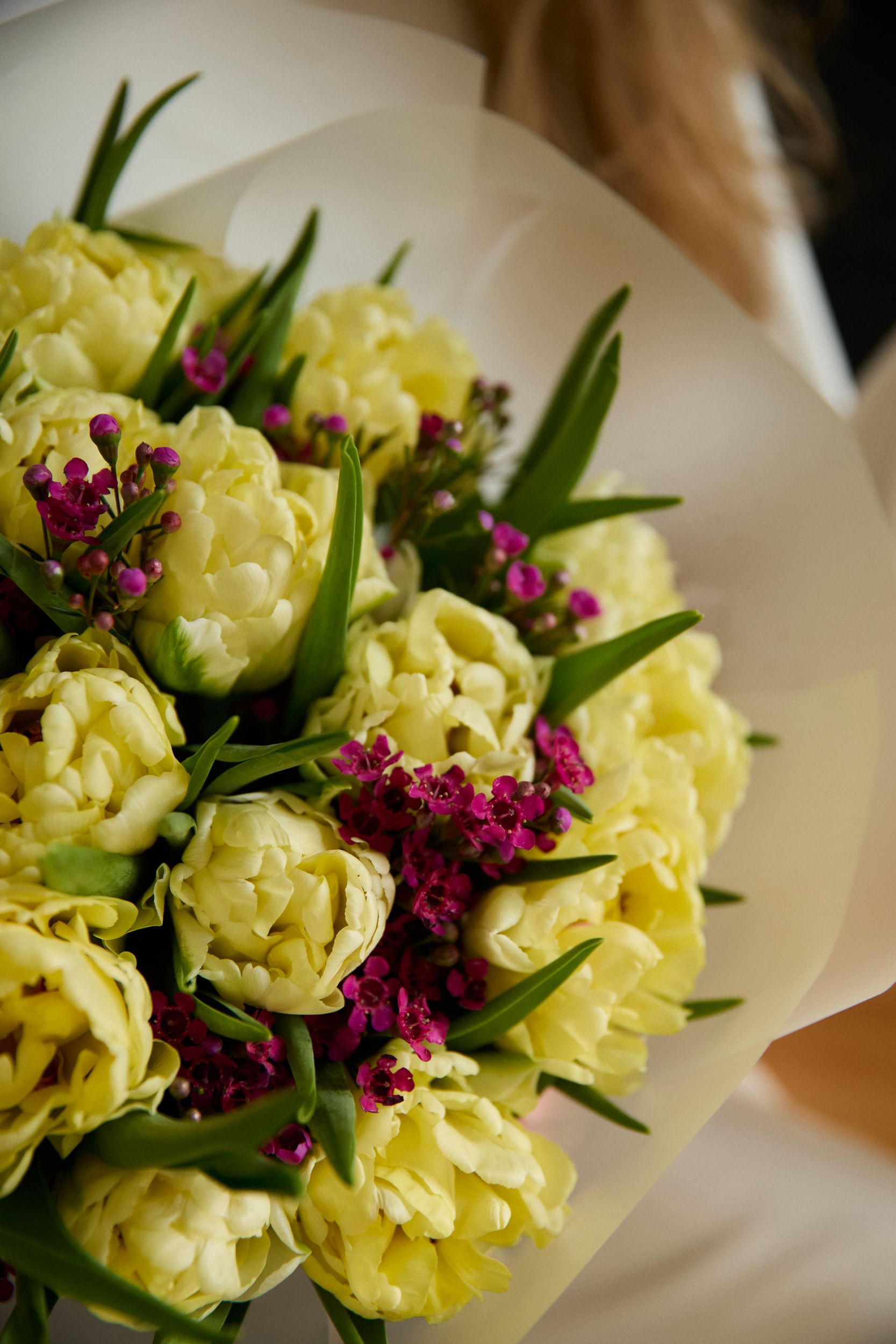 Нежный и стильный букет с лёгким акцентом на природную текстуру. Тюльпаны придают композиции мягкость и живую динамику, создавая ощущение свежести и весеннего настроения, а ваксфлауэр добавляет воздушность и изящные мелкие акценты. Такое сочетание выглядит гармонично и современно, подчёркивая естественную красоту каждого цветка. Букет смотрится аккуратно и утончённо, становясь универсальным подарком для любого повода.