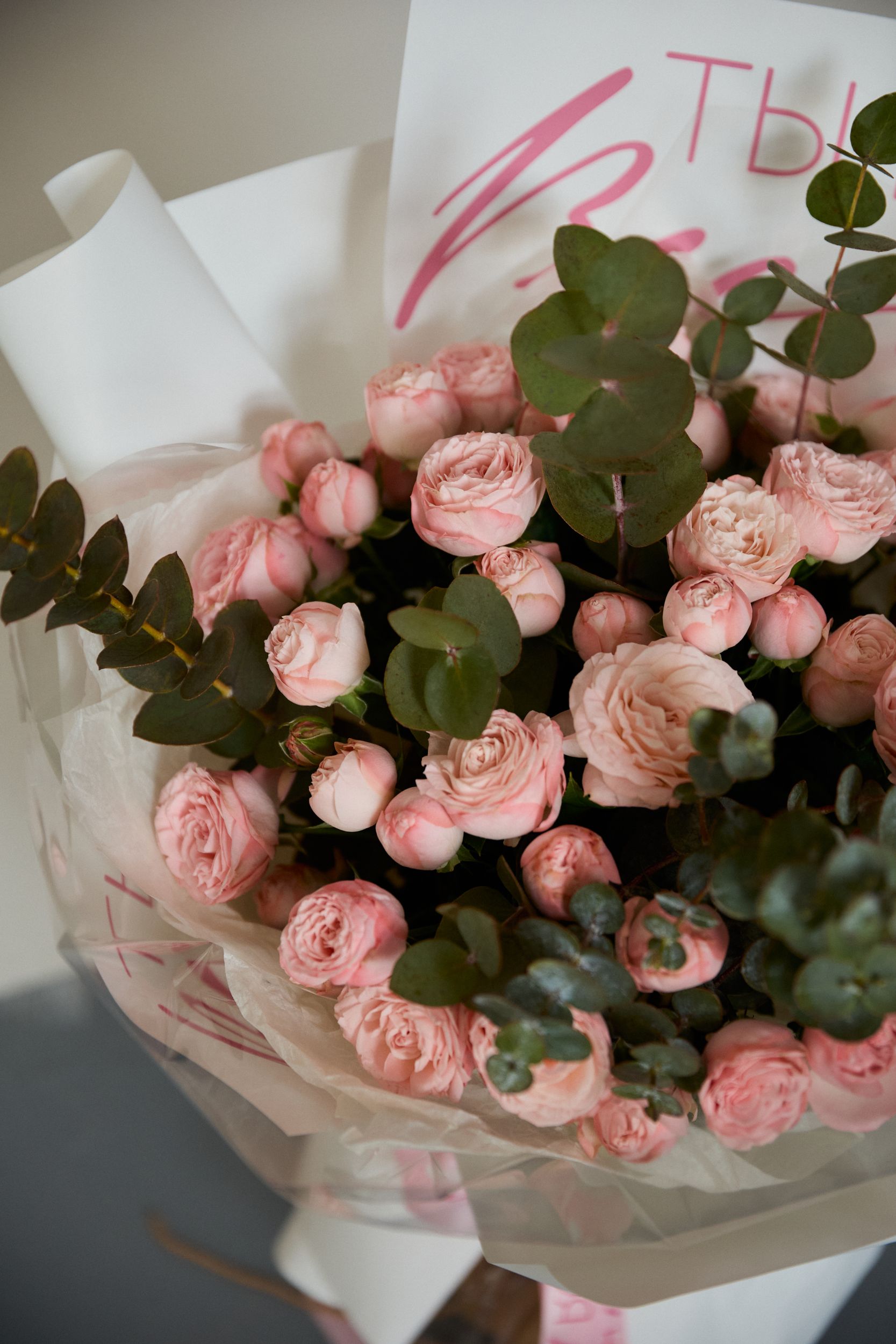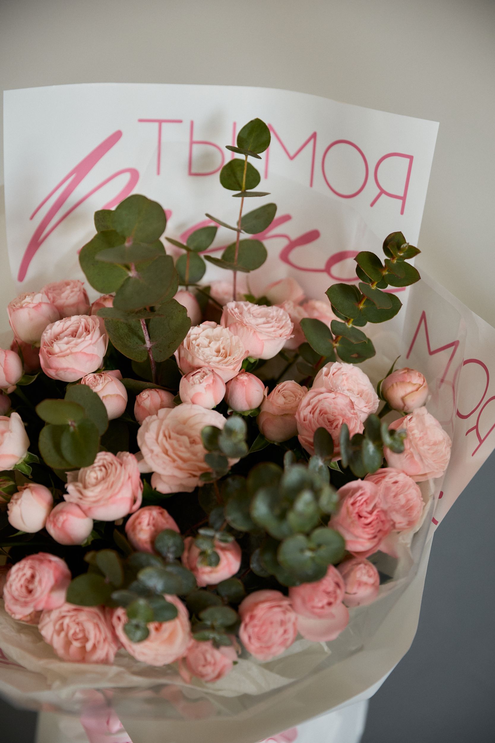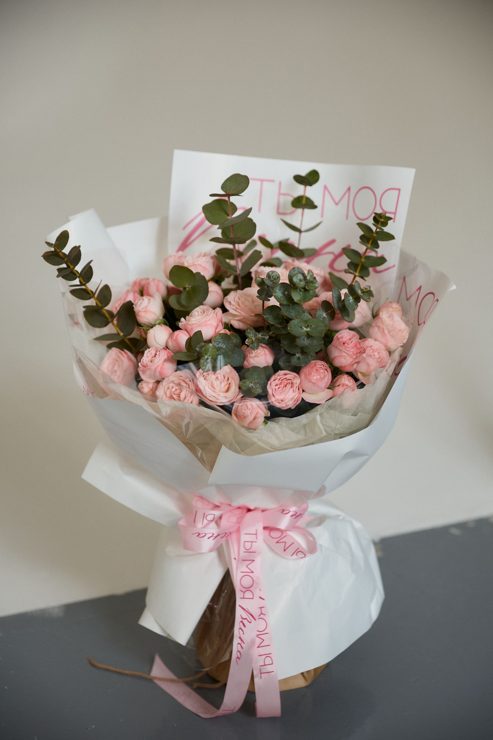 Состав: роза кустовая, эвкалипт, декоративная упаковка.