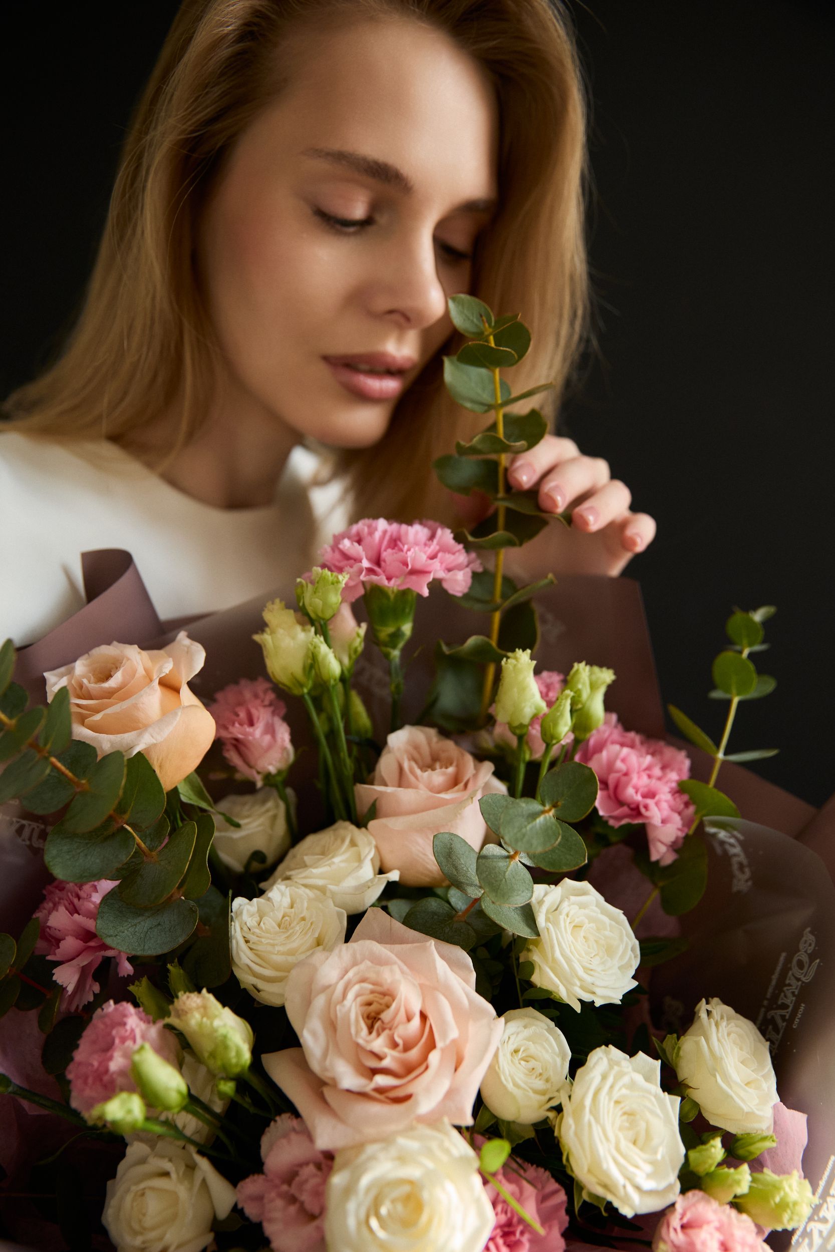Элегантная и гармоничная композиция с утончённой текстурой и выразительным сочетанием цветов. Роза придаёт образу классическую элегантность, кустовая роза создаёт пышность и мягкий объём, эустома добавляет лёгкость и изящество линий, а гвоздика наполняет композицию насыщенностью и выразительностью. Эвкалипт вносит свежие зелёные акценты, подчёркивая естественную красоту цветов. Оформленная в декоративную упаковку, композиция выглядит аккуратно и стильно, становясь прекрасным подарком для любого особенного случая.