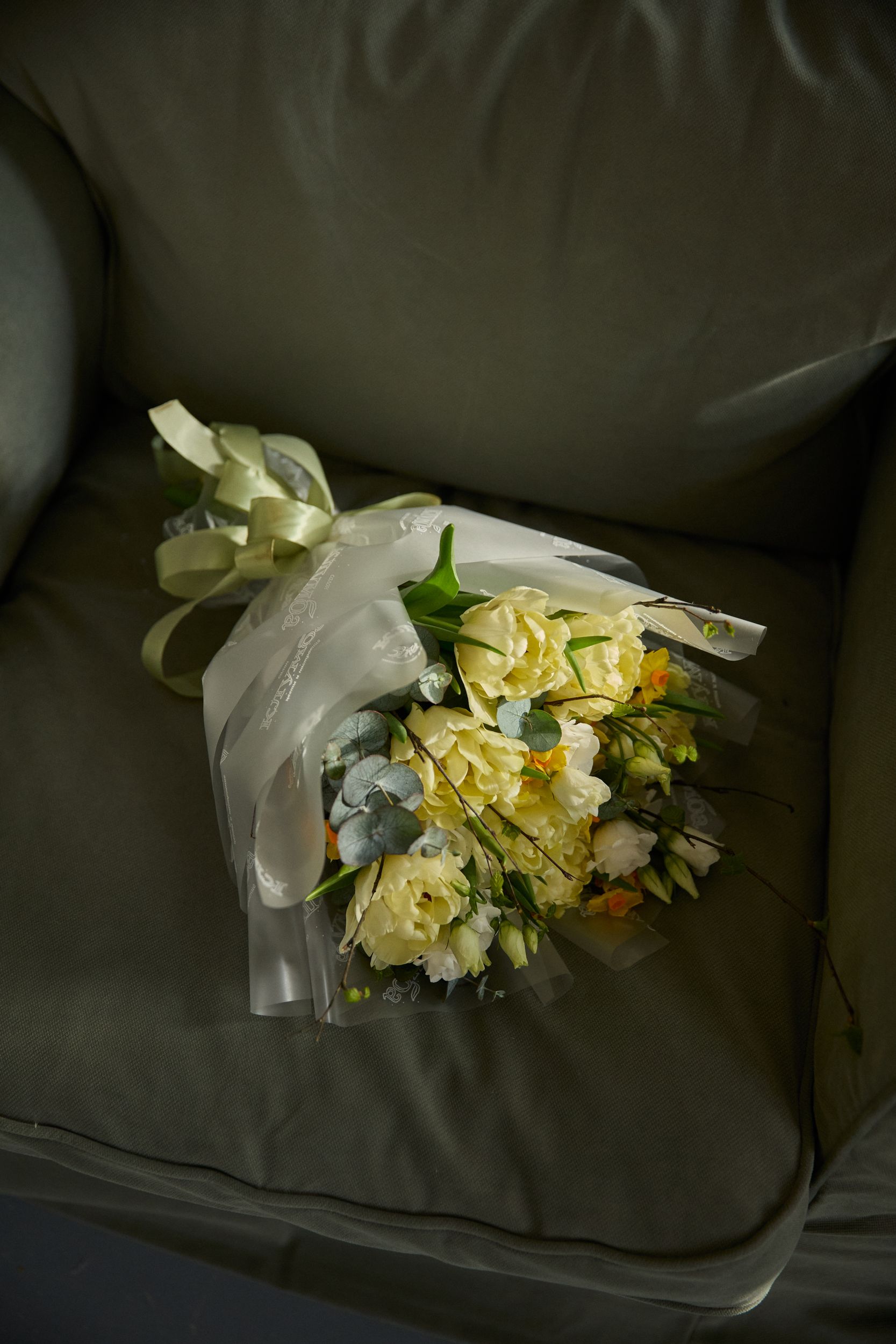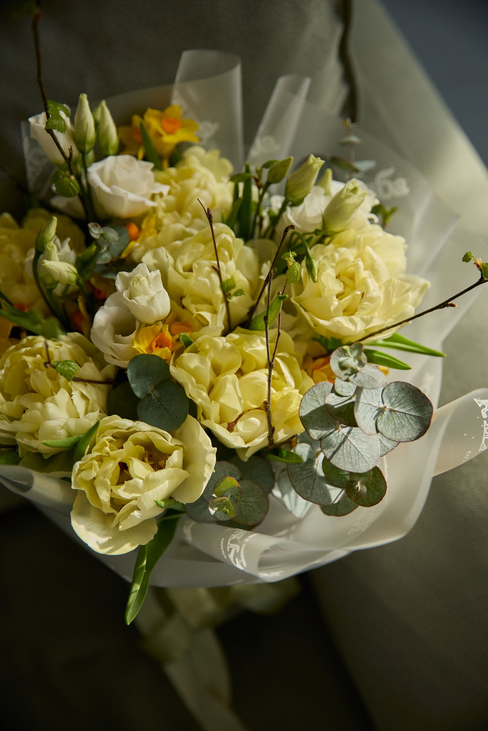 Светлая и выразительная композиция с весенним характером и лёгкой текстурой. Тюльпаны придают образу свежесть и мягкую динамику, эустома добавляет изящества и воздушности, а нарциссы наполняют композицию солнечным настроением и яркими акцентами. Березовые ветки создают структуру и оригинальные линии, а эвкалипт добавляет свежесть и зелёные акценты. Оформленная в декоративную упаковку, композиция выглядит аккуратно и стильно, становясь эффектным подарком для любого весеннего или праздничного случая.