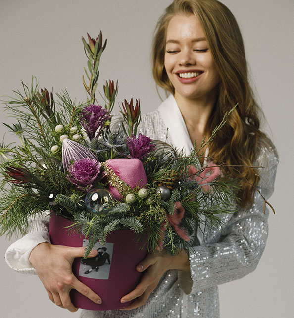 Яркая и стильная композиция в современном праздничном стиле. Фактурная брунья и экзотический сафари создают выразительный акцент, а холодный оттенок эрингиума добавляет изысканности. Пышные веточки хвои и нобелиса наполняют букет зимним настроением и природной свежестью, а декоративные новогодние детали придают ему особое очарование. Идеальный подарок для создания праздничной атмосферы.